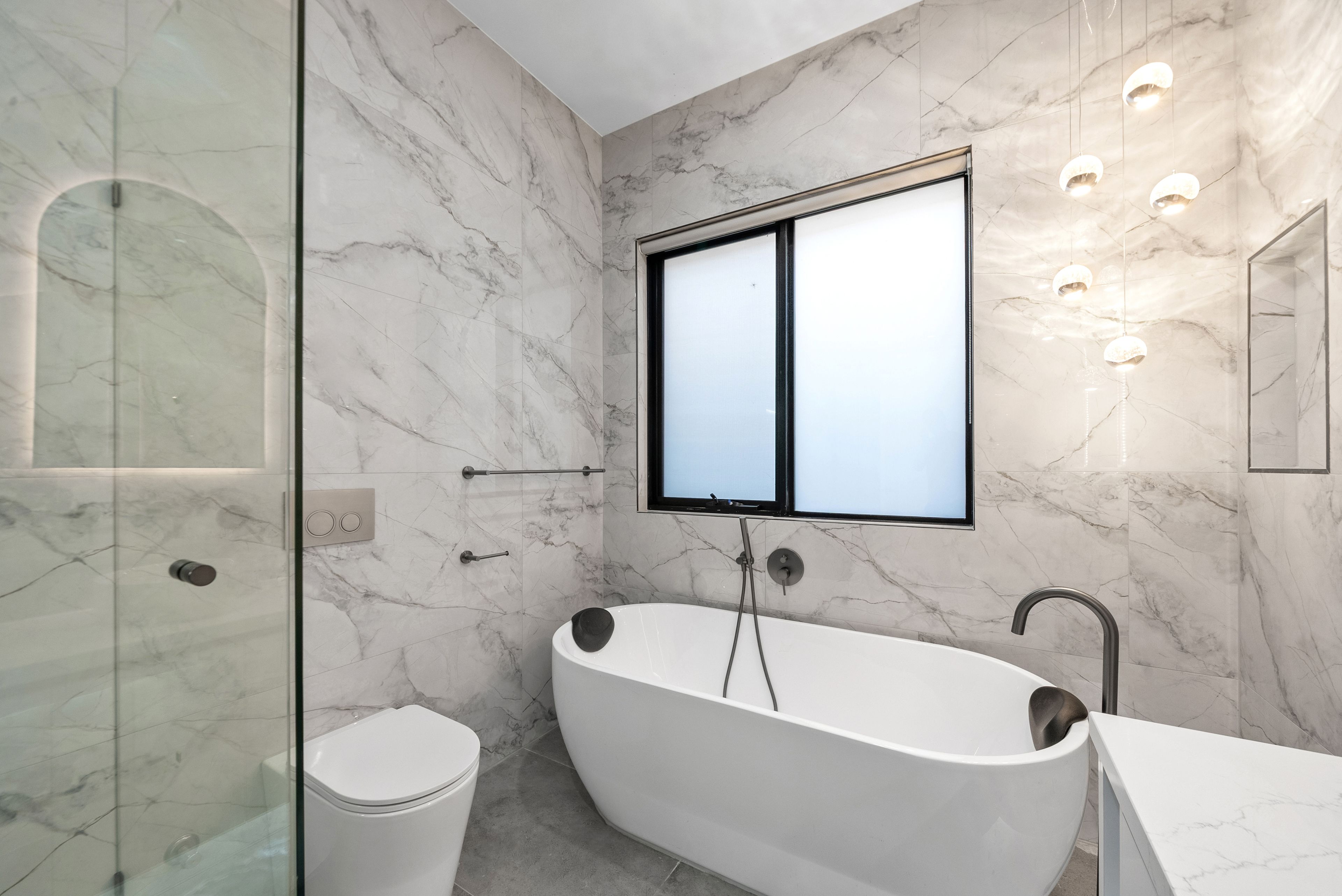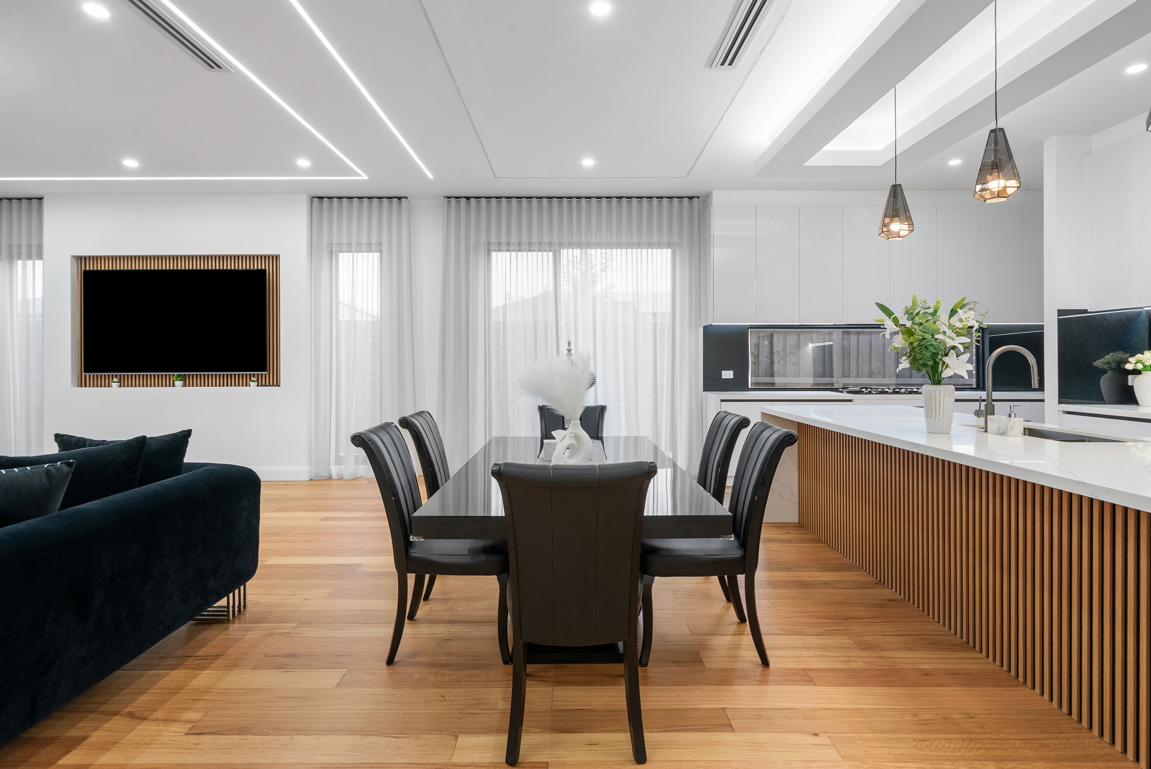 Stepping inside, the home immediately feels spacious and inviting. Soaring three-metre ceilings enhance the sense of openness throughout, while engineered blackbutt flooring adds warmth and understated sophistication to the main living areas. Large double-glazed windows allow natural light to filter through the interiors while also improving insulation and acoustic comfort, contributing to a home that feels both refined and functional.