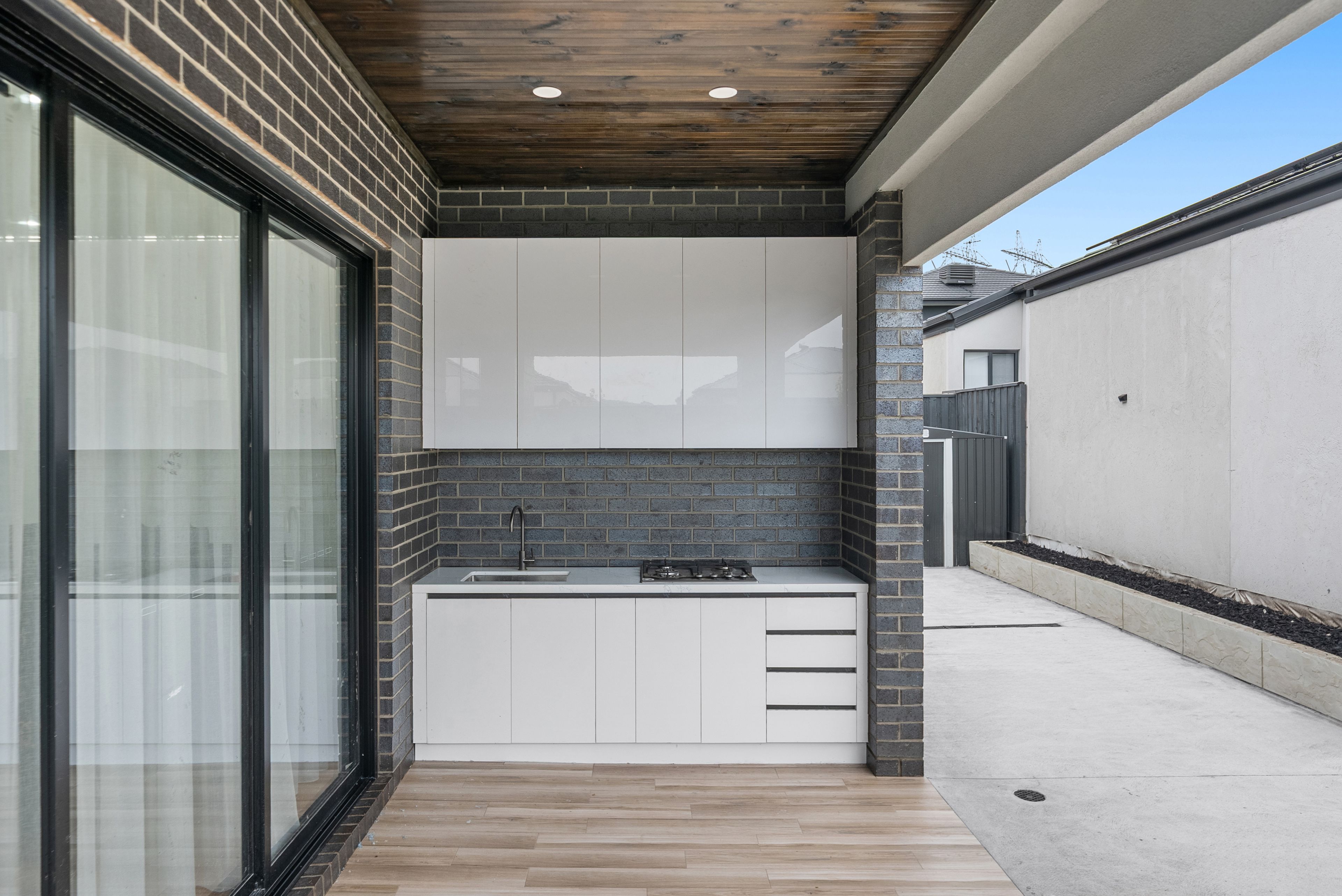 Glass doors extend the living space outdoors to a covered alfresco area, providing a welcoming setting for year-round entertaining or relaxed evenings at home. The backyard offers a comfortable outdoor environment while remaining low maintenance, making it ideal for busy families who still value outdoor living.
