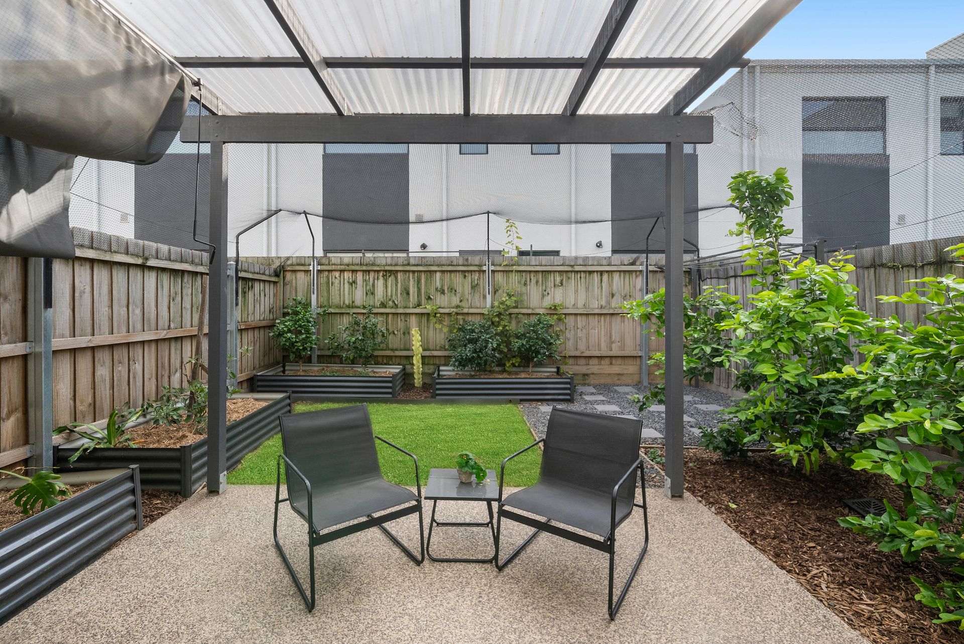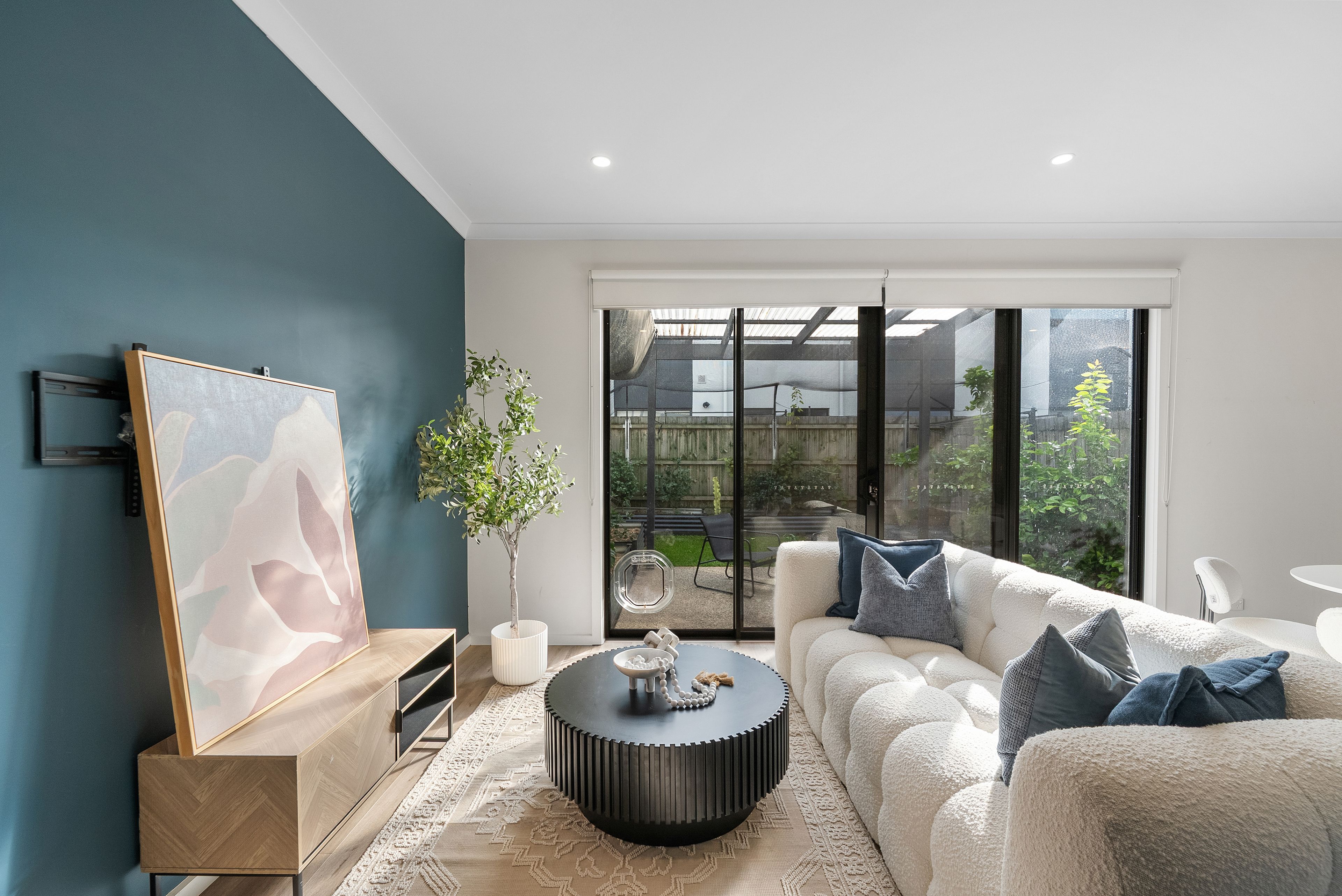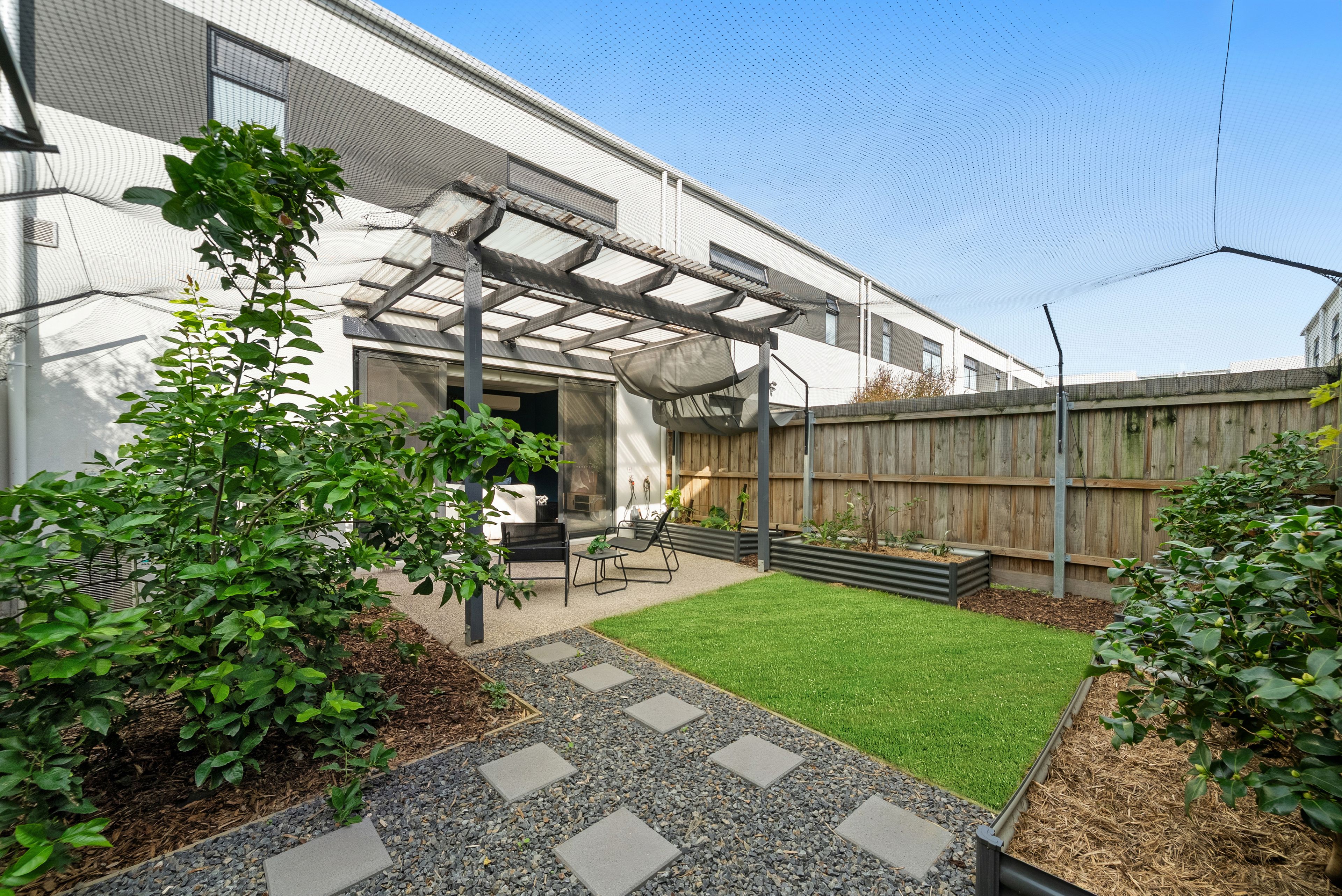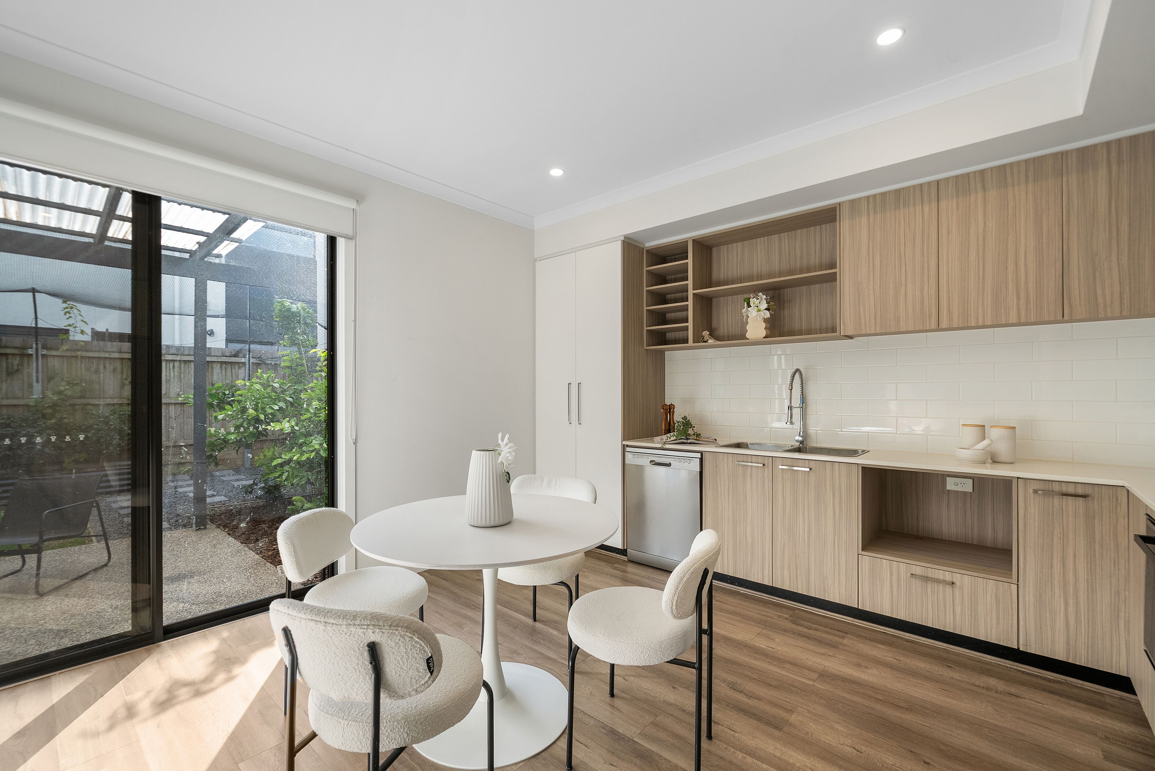 The ground floor is centred around a spacious open-plan living and dining zone, creating an inviting setting for both everyday living and entertaining. The modern kitchen is well appointed with stainless steel appliances, including a 90cm oven with large induction cooktop, a double sized fridge cavity, quality finishes, and ample storage and bench space, ensuring practicality is matched with style. Flowing seamlessly from the living area, glass doors open to a covered patio and a fully enclosed backyard with cat netting, offering a private, pet-friendly outdoor space perfect for relaxed dining or quiet weekend enjoyment without the upkeep. A downstairs powder room adds everyday convenience, along with internal access to a secure single garage.