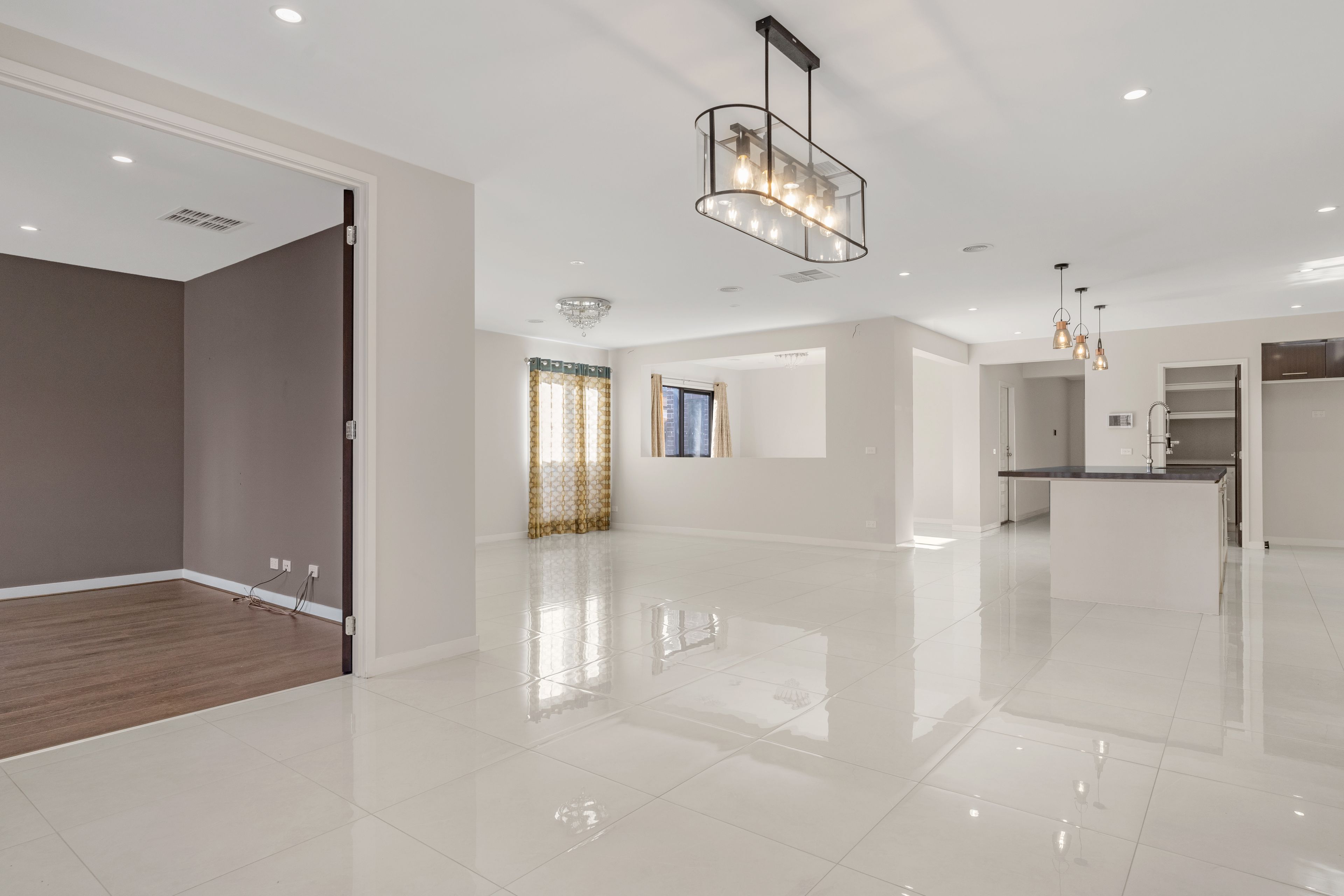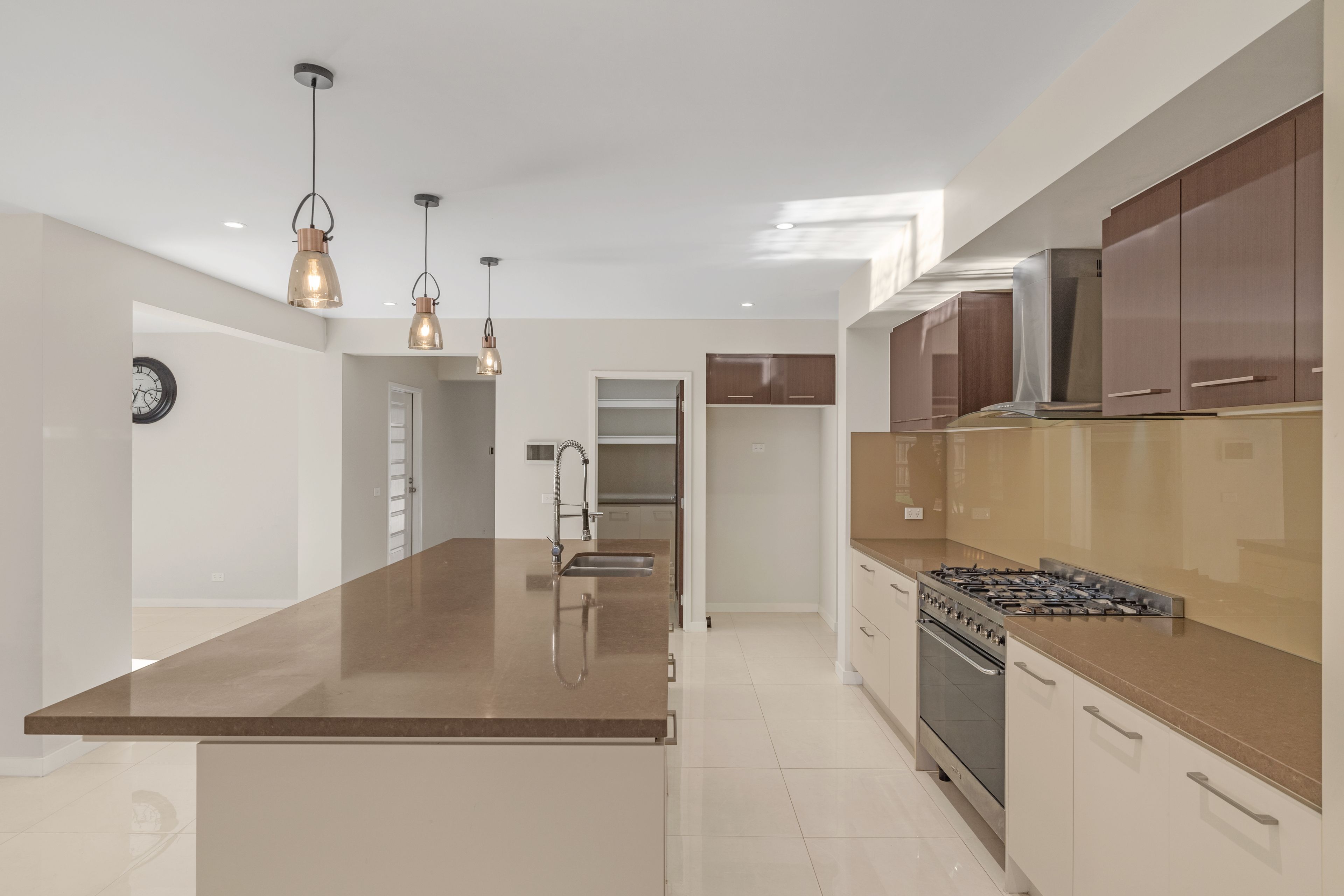 A large open-plan kitchen, meals, and family area. With an ultra-modern kitchen. Boasting a Butlers' Pantry, Caesarstone benchtops, overhead lights, island benches, glass splashback, and 900mm stainless-steel appliances including gas cooktops, a large all-in-one oven & a dishwasher. A chef's dream. Located next to the stunning theatre room. For the family to enjoy some family bonding time or even, a moment of privacy to relax.
