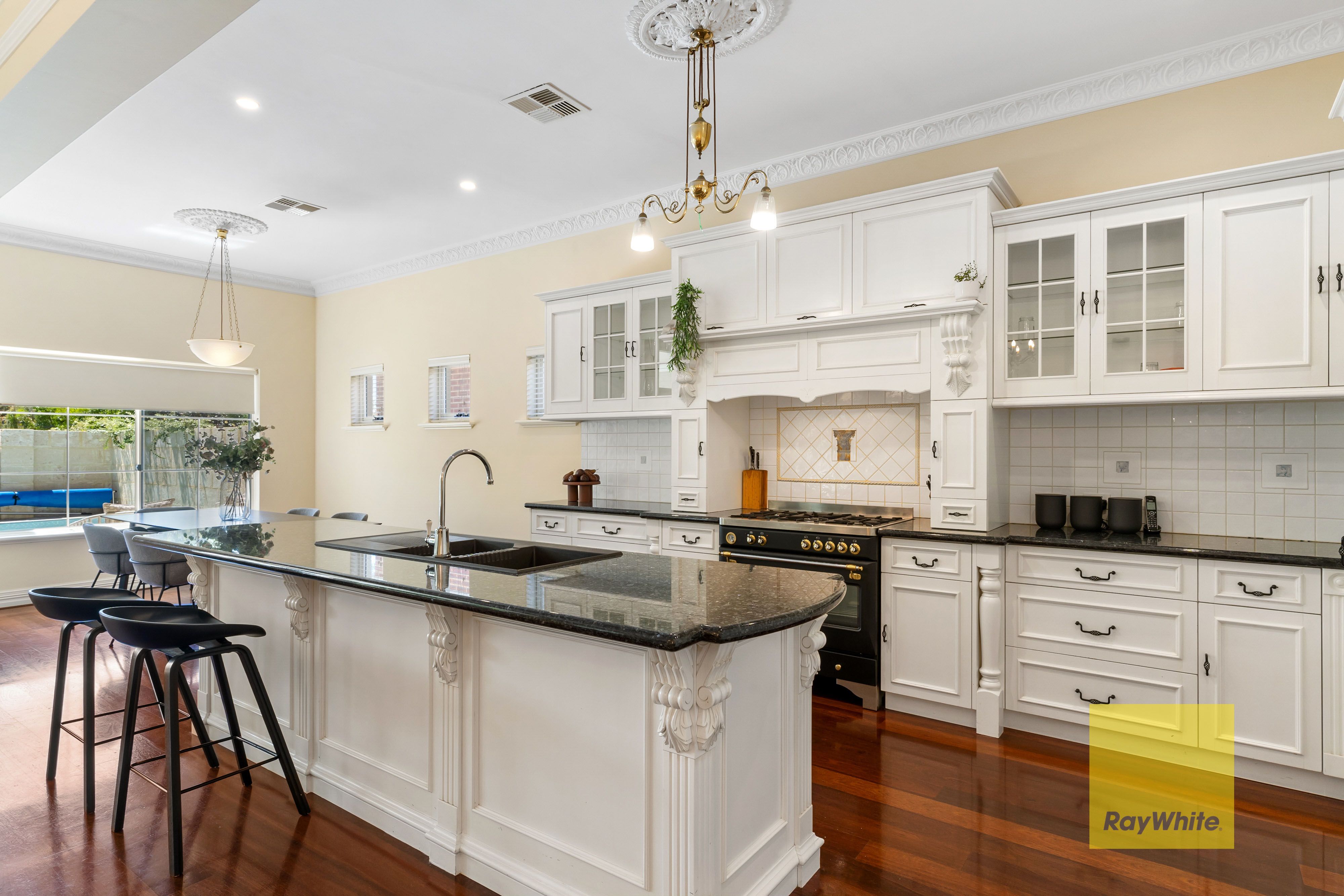 The open-plan kitchen effortlessly blends classic moulded cabinetry and granite countertops with contemporary luxuries, including an integrated microwave and dishwasher, a freestanding Savoir-Faire gas cooker and glass splashbacks. From the walk-in pantry, you can access the downstairs temperature-controlled wine cellar, fitted with racks to house your collection. French doors open from the living area to the travertine-paved alfresco and pool, reticulated and manicured gardens and the self-contained studio, complete with a kitchen, living and sleeping area, and an integrated bathroom/laundry.