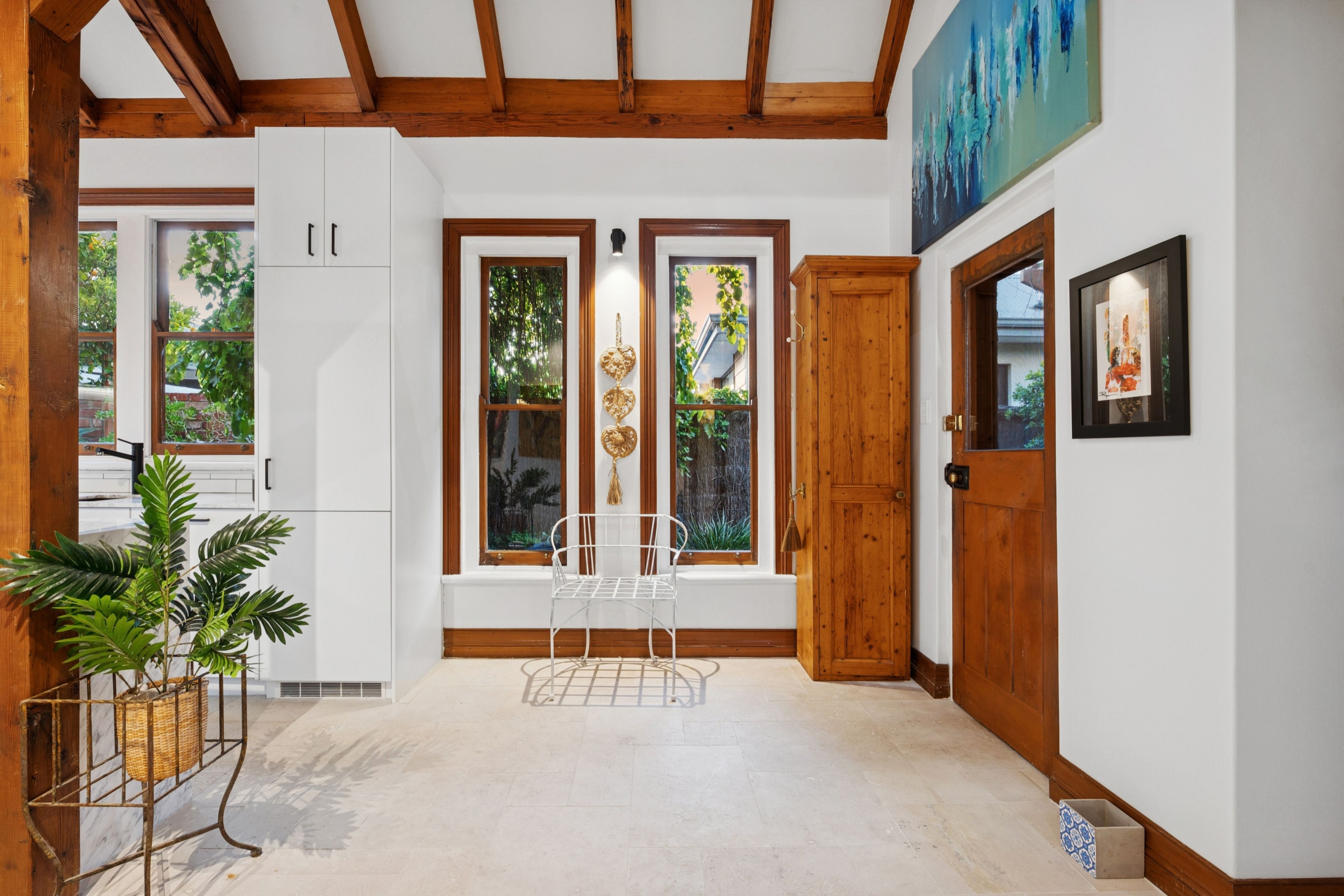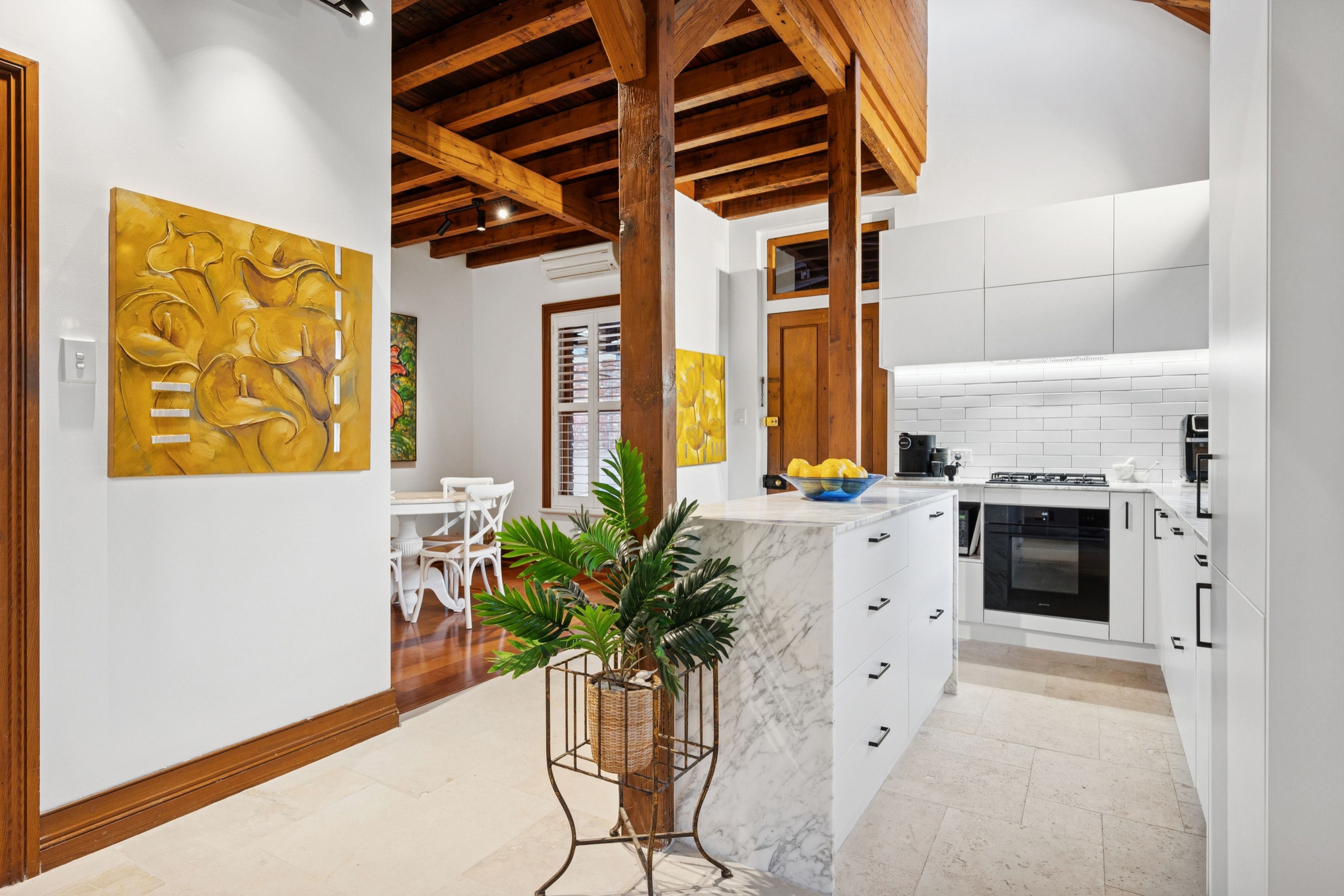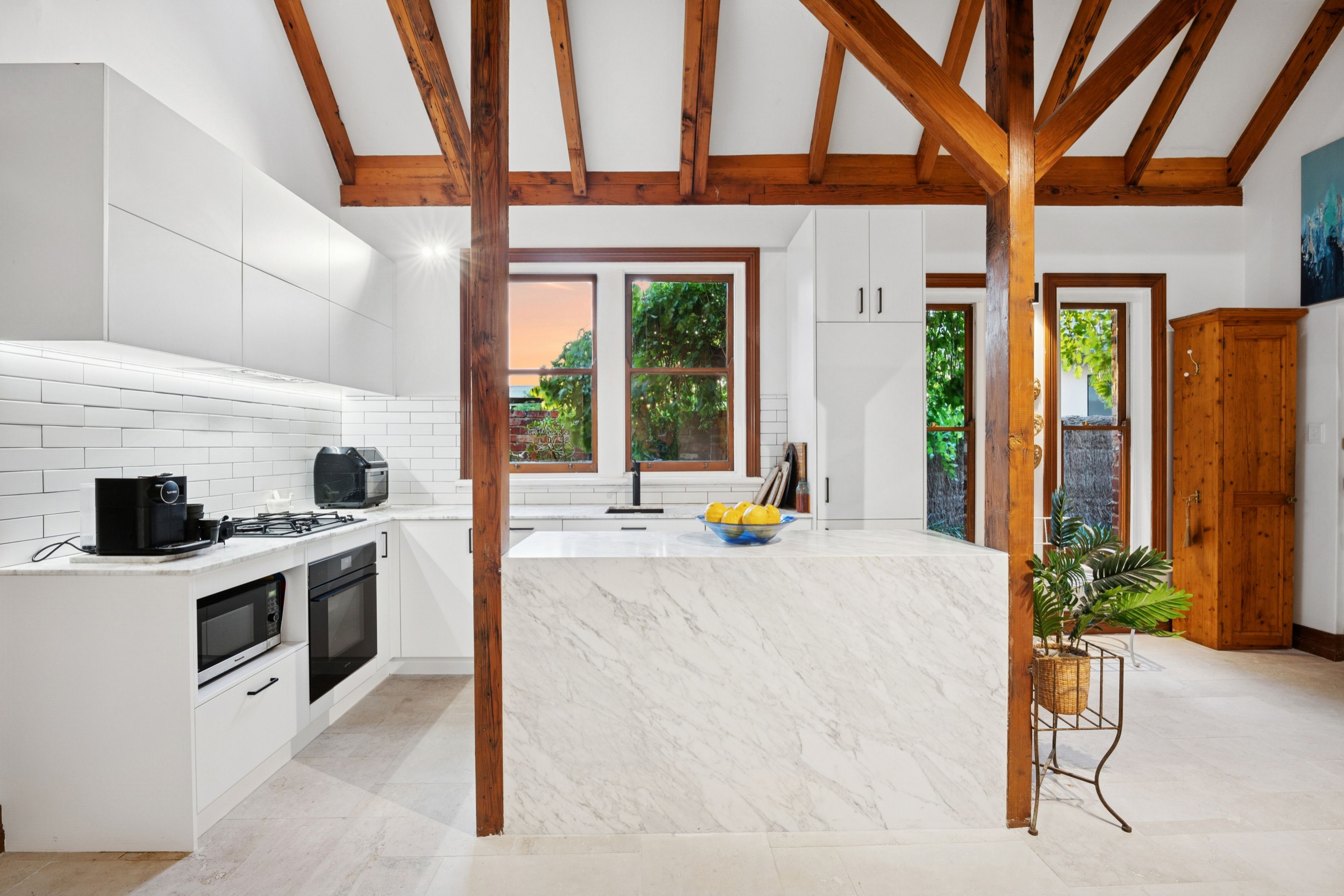 Inside, the home's natural material palette of recycled timber and brick remains a defining feature, now complemented by plantation shutters, new lighting and a fresh coat of paint throughout. A soaring void creates a wonderful sense of space, while the newly installed kitchen is finished with Carrara stone, integrated appliances and travertine flooring. The kitchen and meals area spill effortlessly to a leafy courtyard garden, framed by blooming wisteria, offering an intimate setting for morning coffee or relaxed alfresco dining.