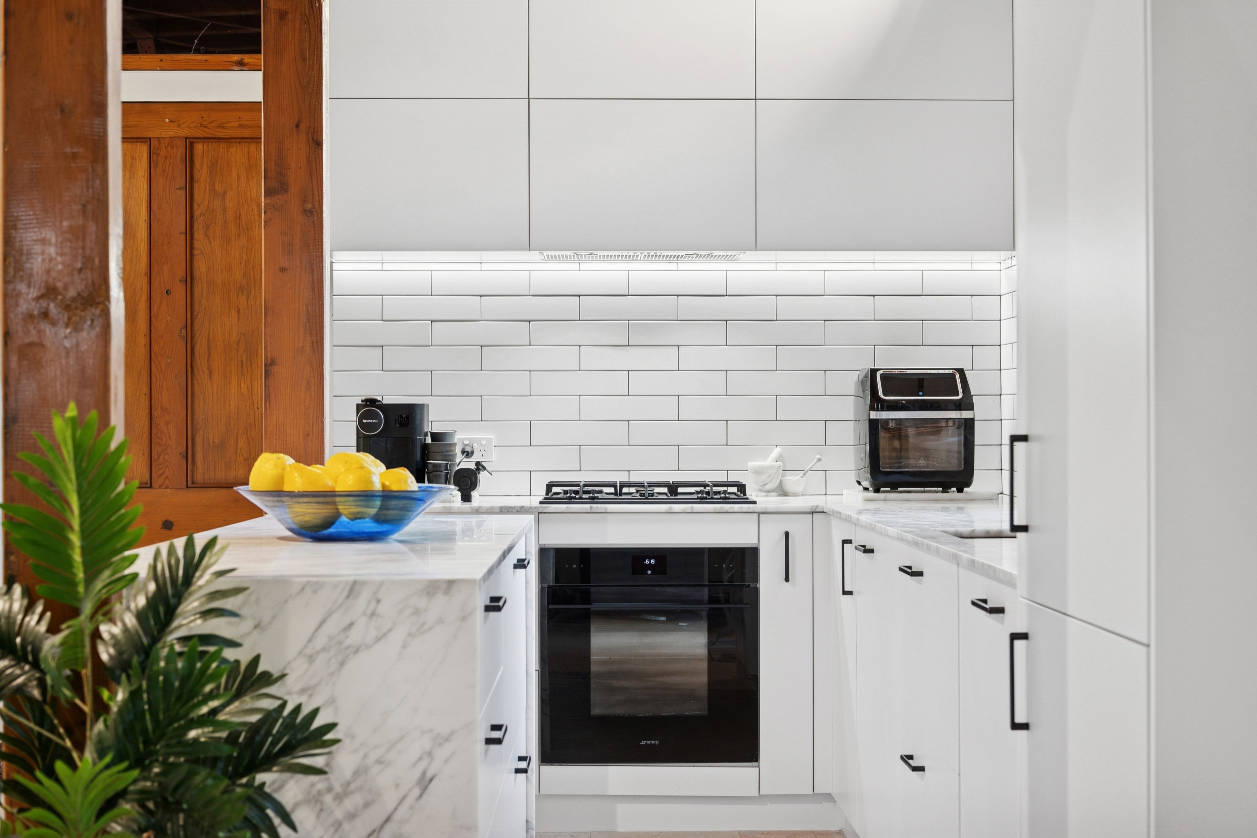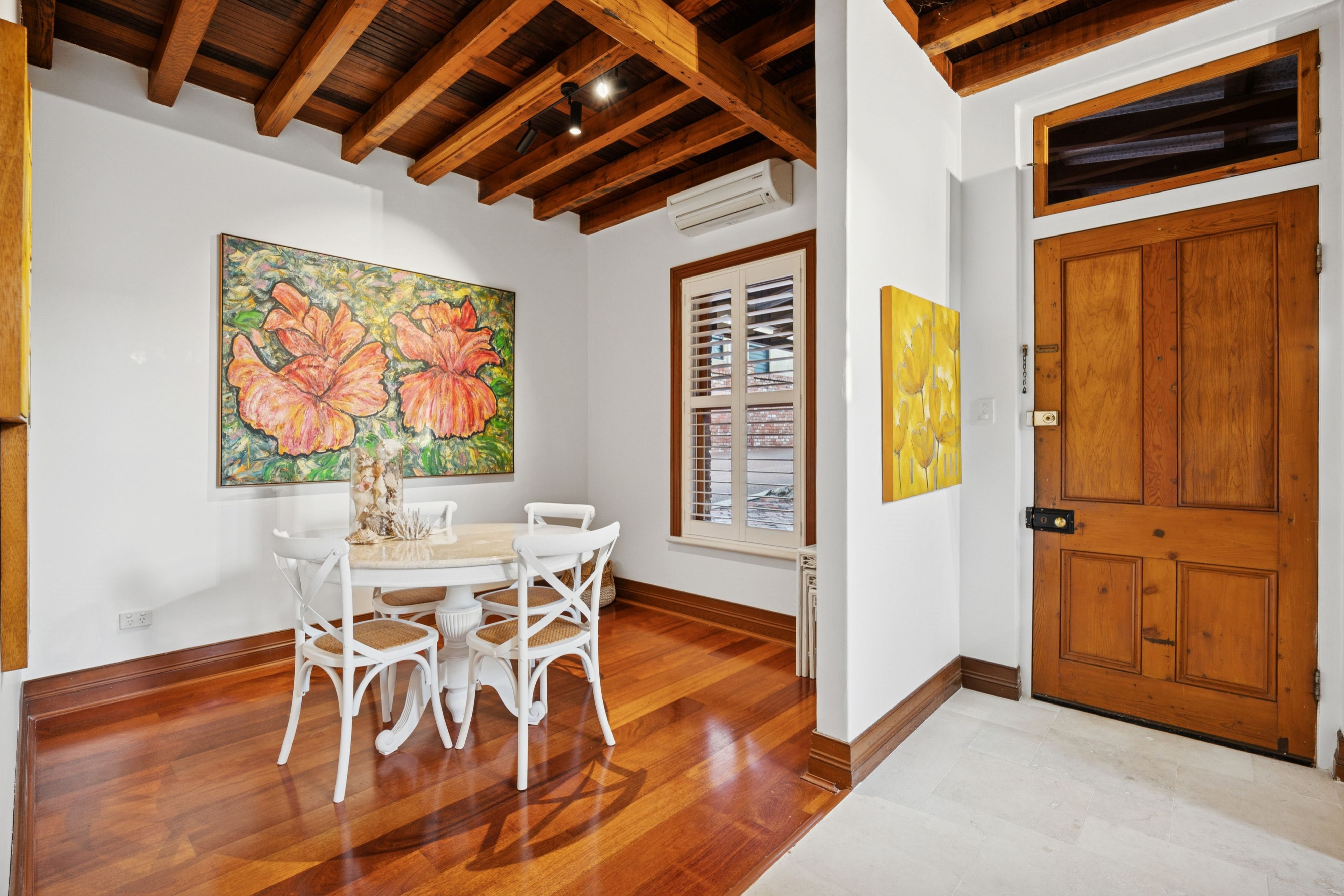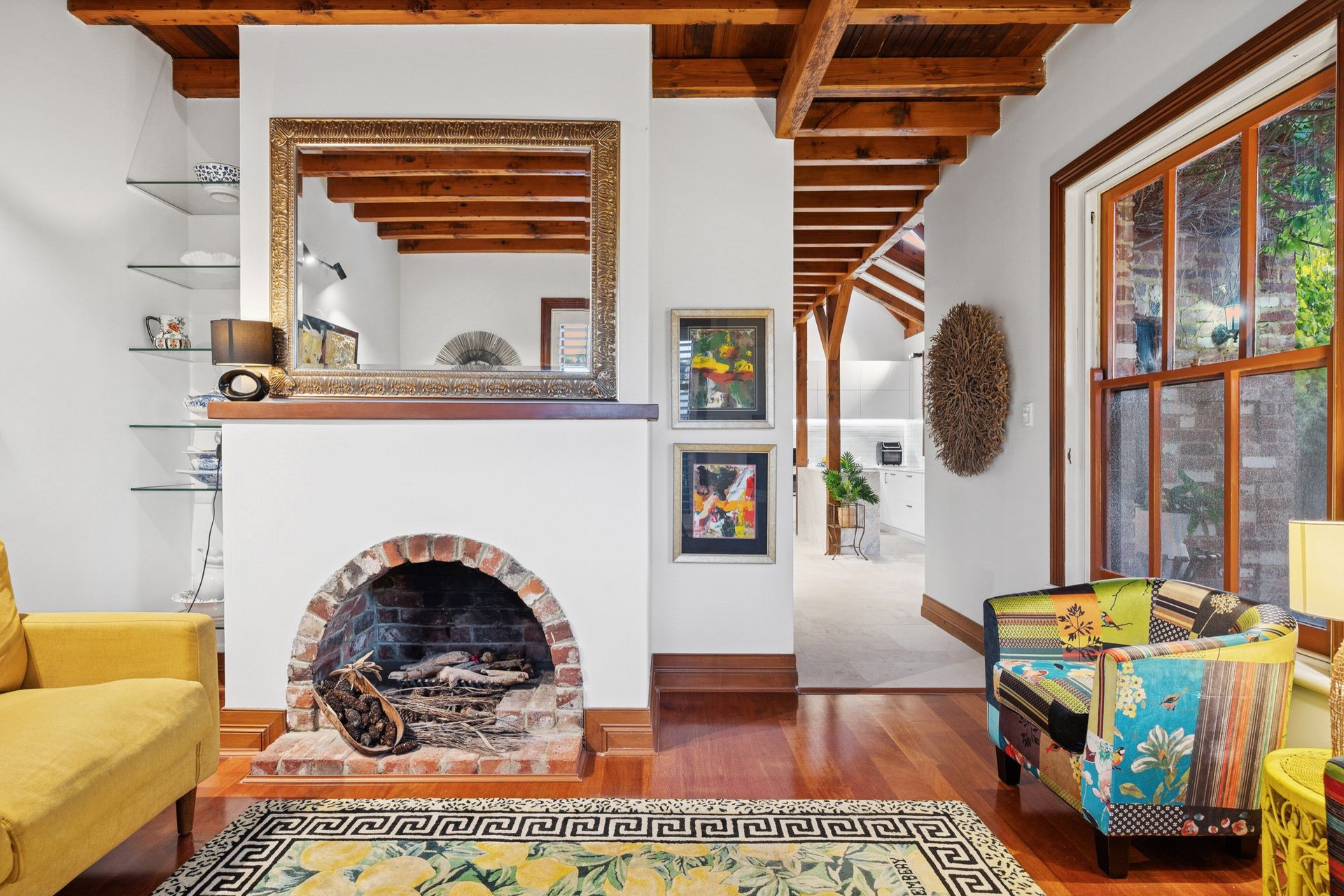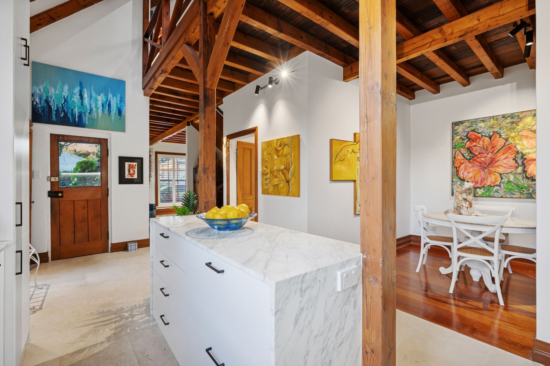 Inside, the home's natural material palette of recycled timber and brick remains a defining feature, now complemented by plantation shutters, new lighting and a fresh coat of paint throughout. A soaring void creates a wonderful sense of space, while the newly installed kitchen is finished with Carrara stone, integrated appliances and travertine flooring. The kitchen and meals area spill effortlessly to a leafy courtyard garden, framed by blooming wisteria, offering an intimate setting for morning coffee or relaxed alfresco dining.