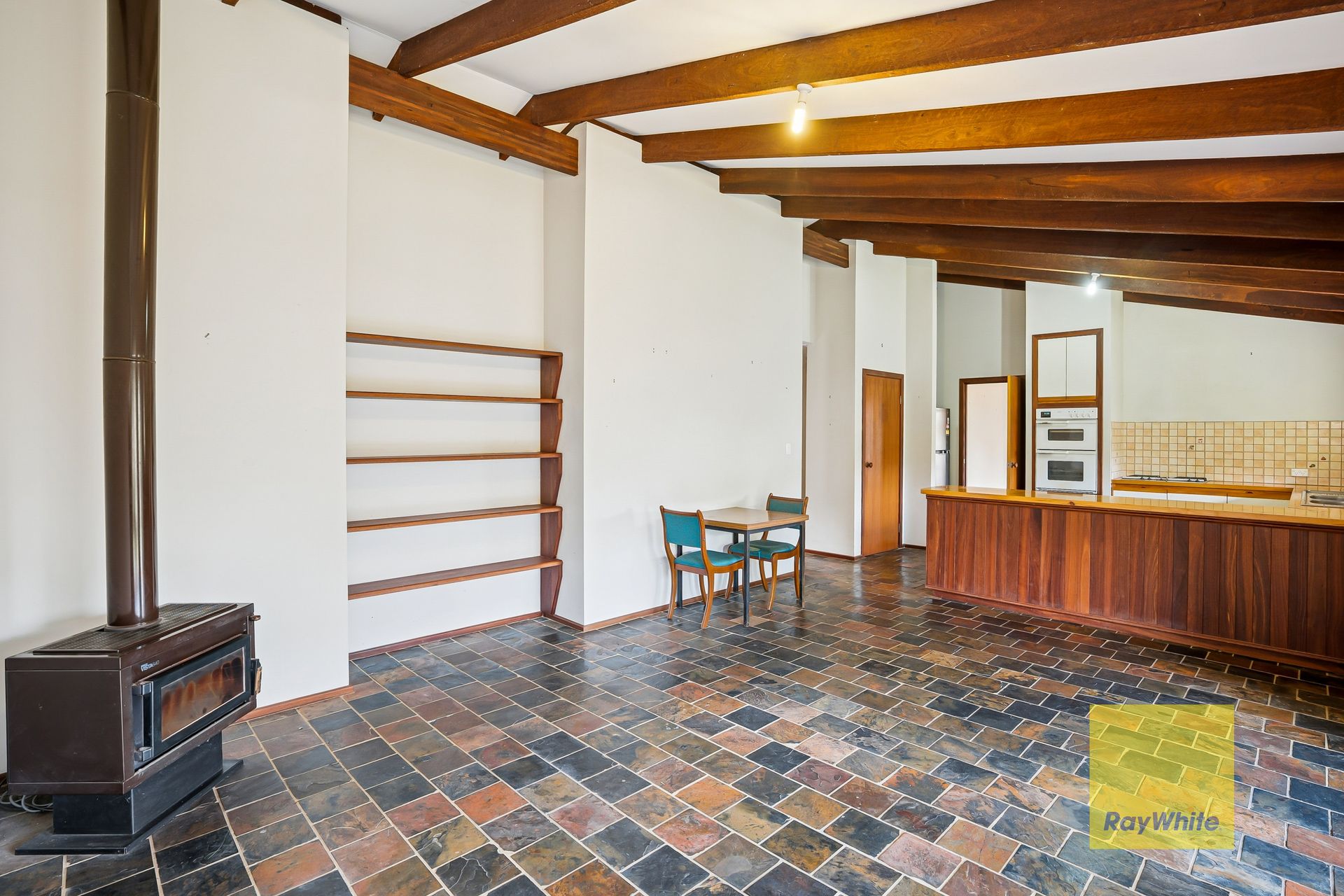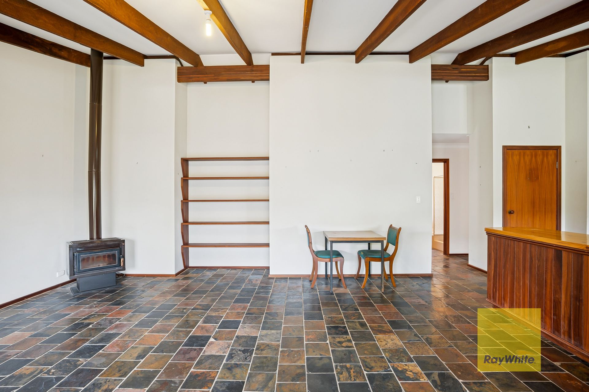 Set behind lush gardens and a welcoming front verandah, the home features classic hills character with cedar cladding, an iron roof, stumped construction, and beautiful Jarrah timber flooring. Inside, the spacious and practical layout includes an expansive main living area with soaring vaulted ceilings, a generous master suite with a walk-in robe and ensuite (ample room for a king-sized bed), and a second living or dining area adjacent to the full kitchen, complete with a gas range, electric oven, and slow-combustion heater.