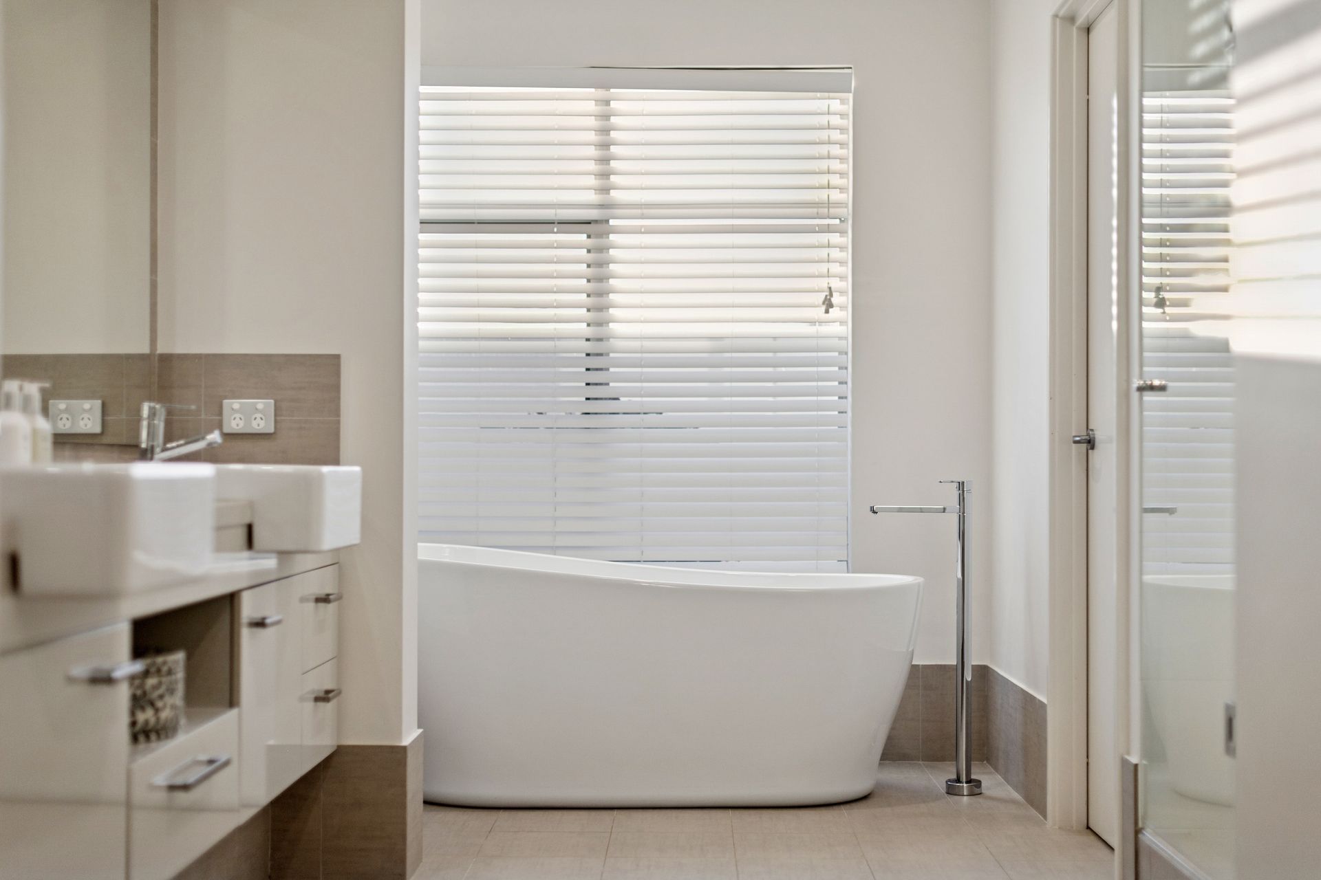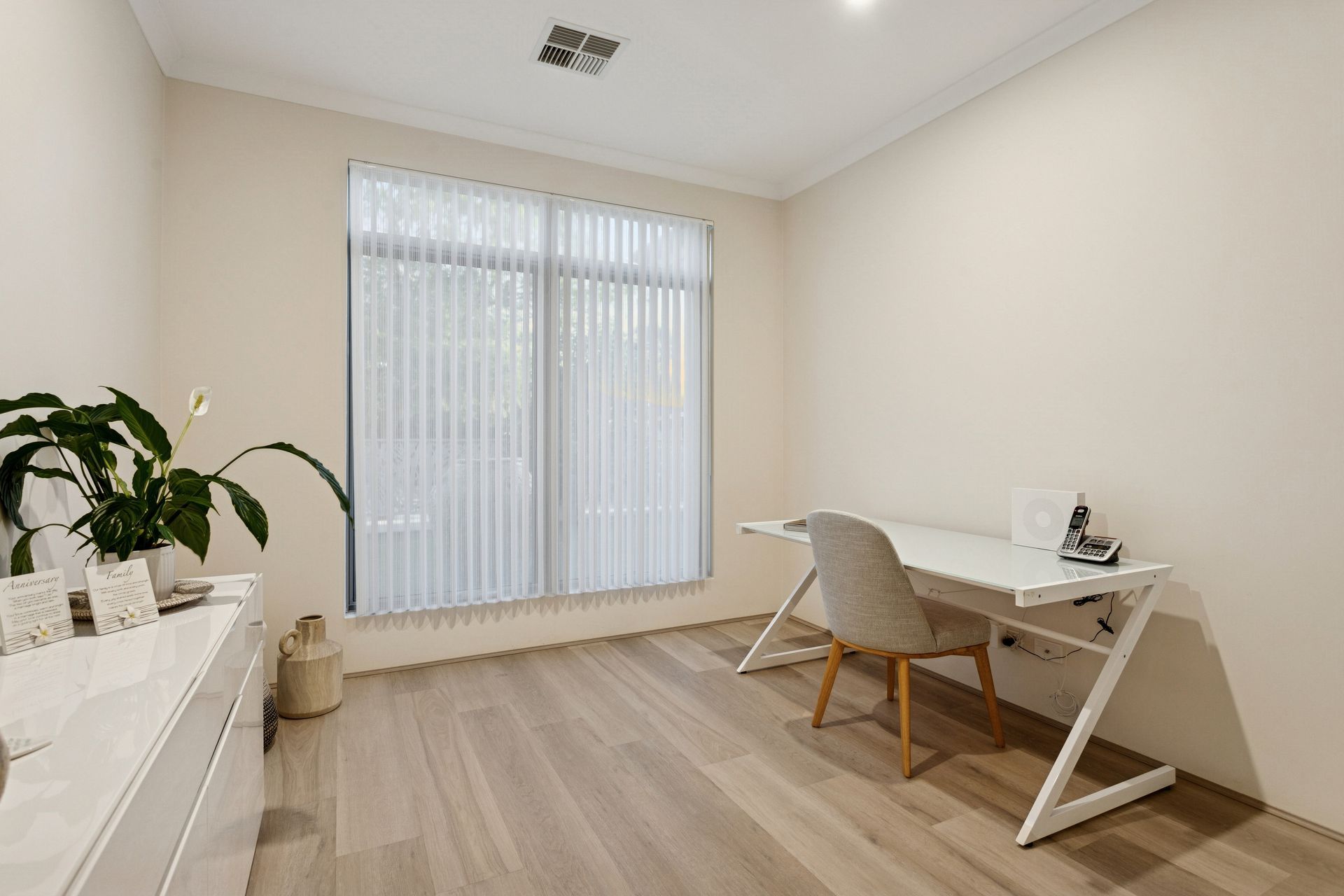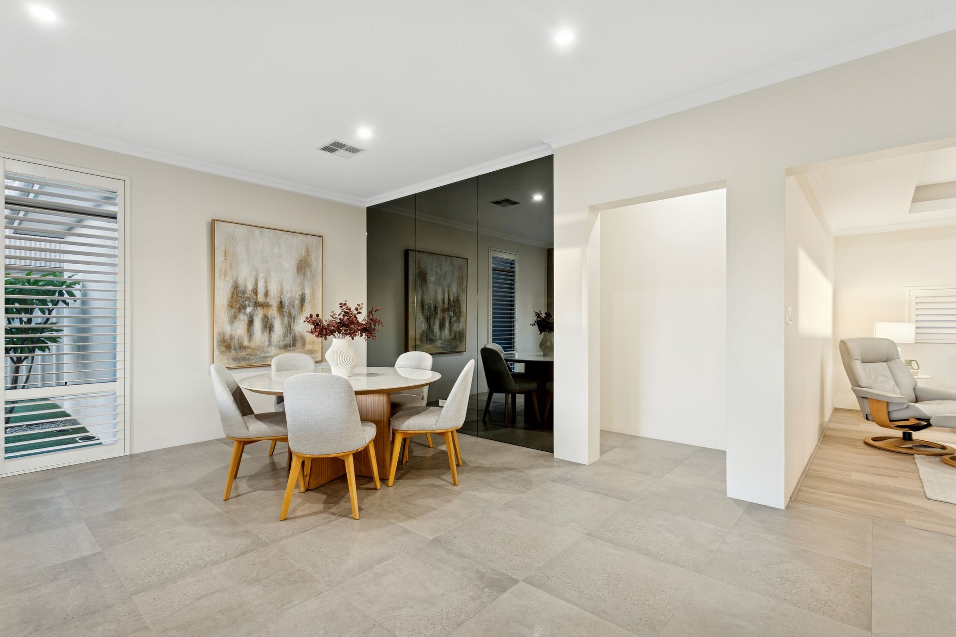 The accommodation wing continues the theme of space and comfort. Generous minor bedrooms, each fitted with plantation shutters and built-in storage, are serviced by a beautifully finished family bathroom and separate WC. A dedicated media room with custom Tasmanian Oak-style cabinetry offers a refined space to unwind.