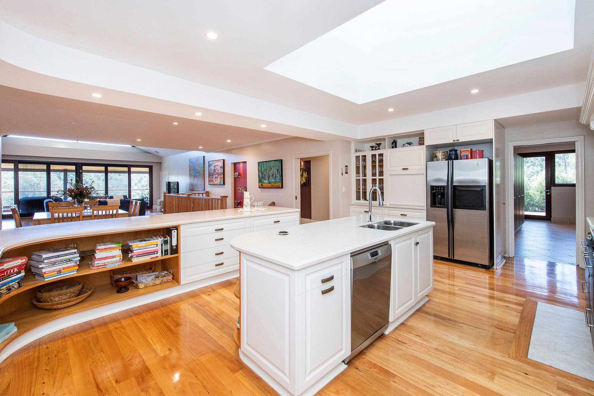 The open plan family room also shares a double sided fire place with the formal dining and lounge rooms. All leading out onto a magnificent deck with beautiful Jarrah decking and views that draw the paddocks in. Breathtaking setting for entertaining with friends and family.