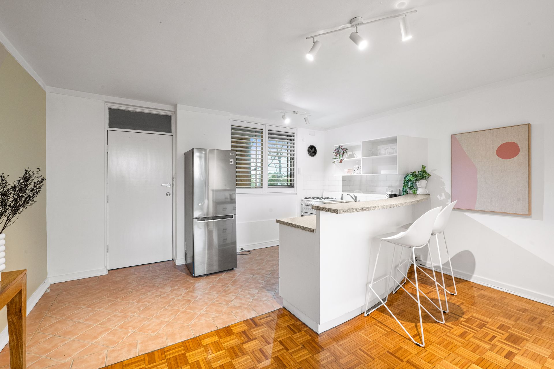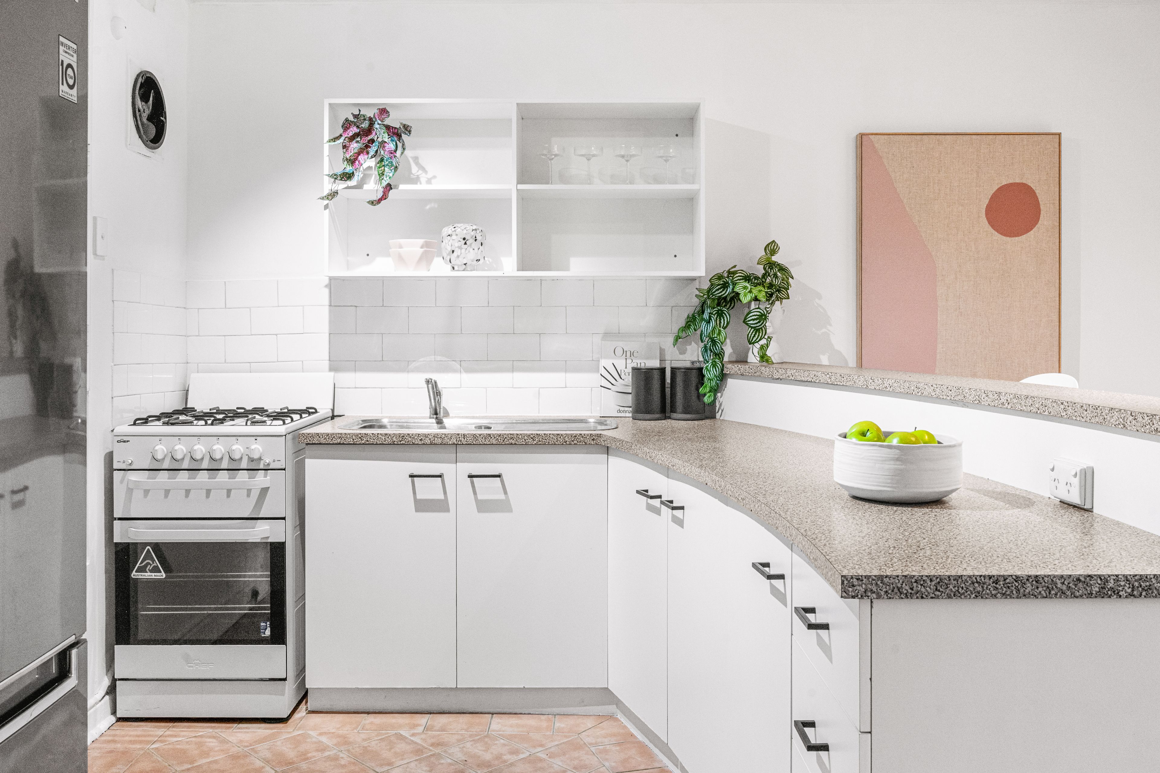There is a bathroom with terracotta floor at the western end of the apartment, while the eastern end holds the kitchen. Neat and tidy, the kitchen has a large window with white Plantation shutters, white cabinets teamed with black hardware and grey laminate benchtops, with a decent amount of workspace. Cook dinner while enjoying the view of the harbour lights. There is a gas cooktop and oven and security mesh entry door.