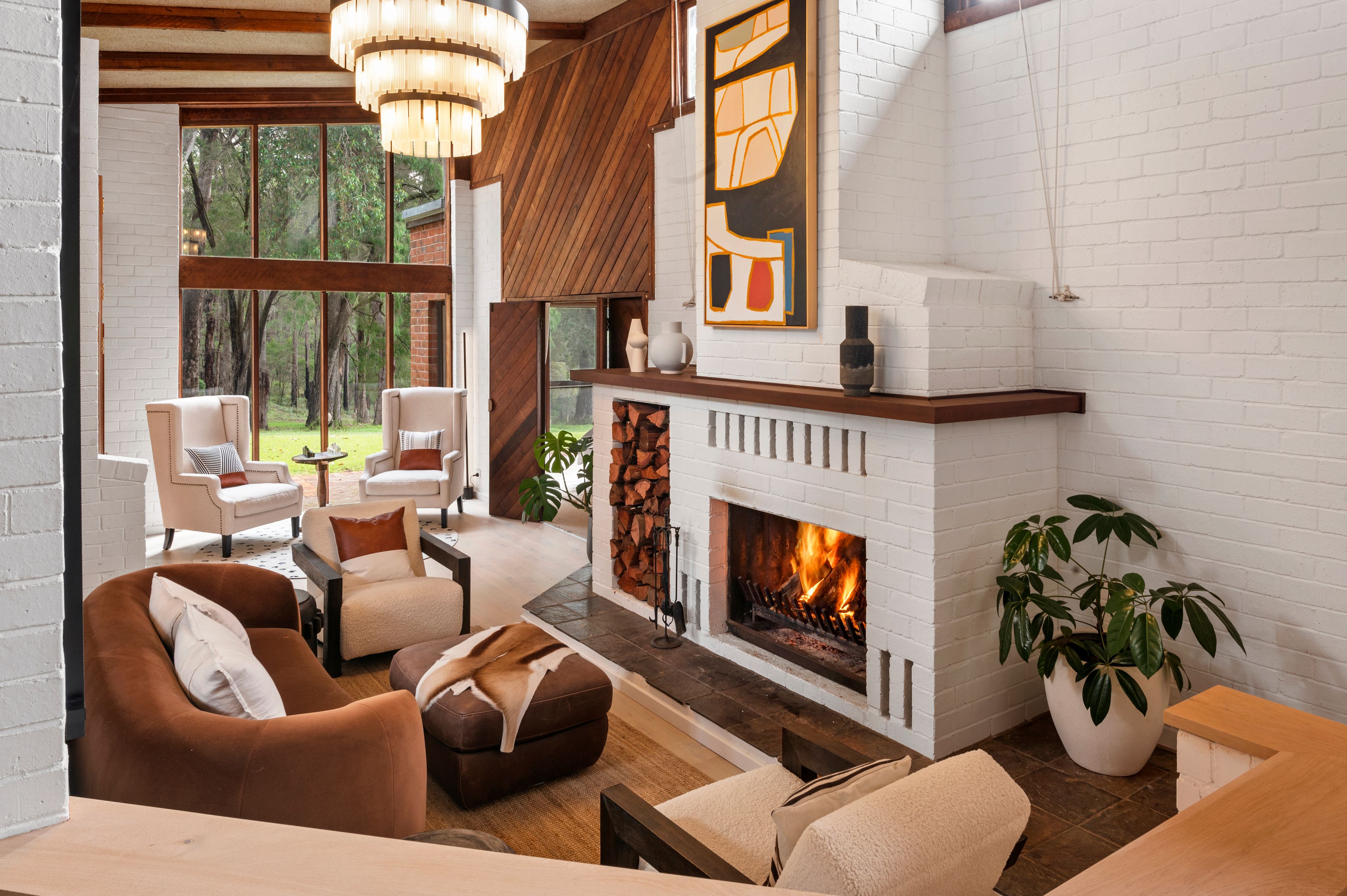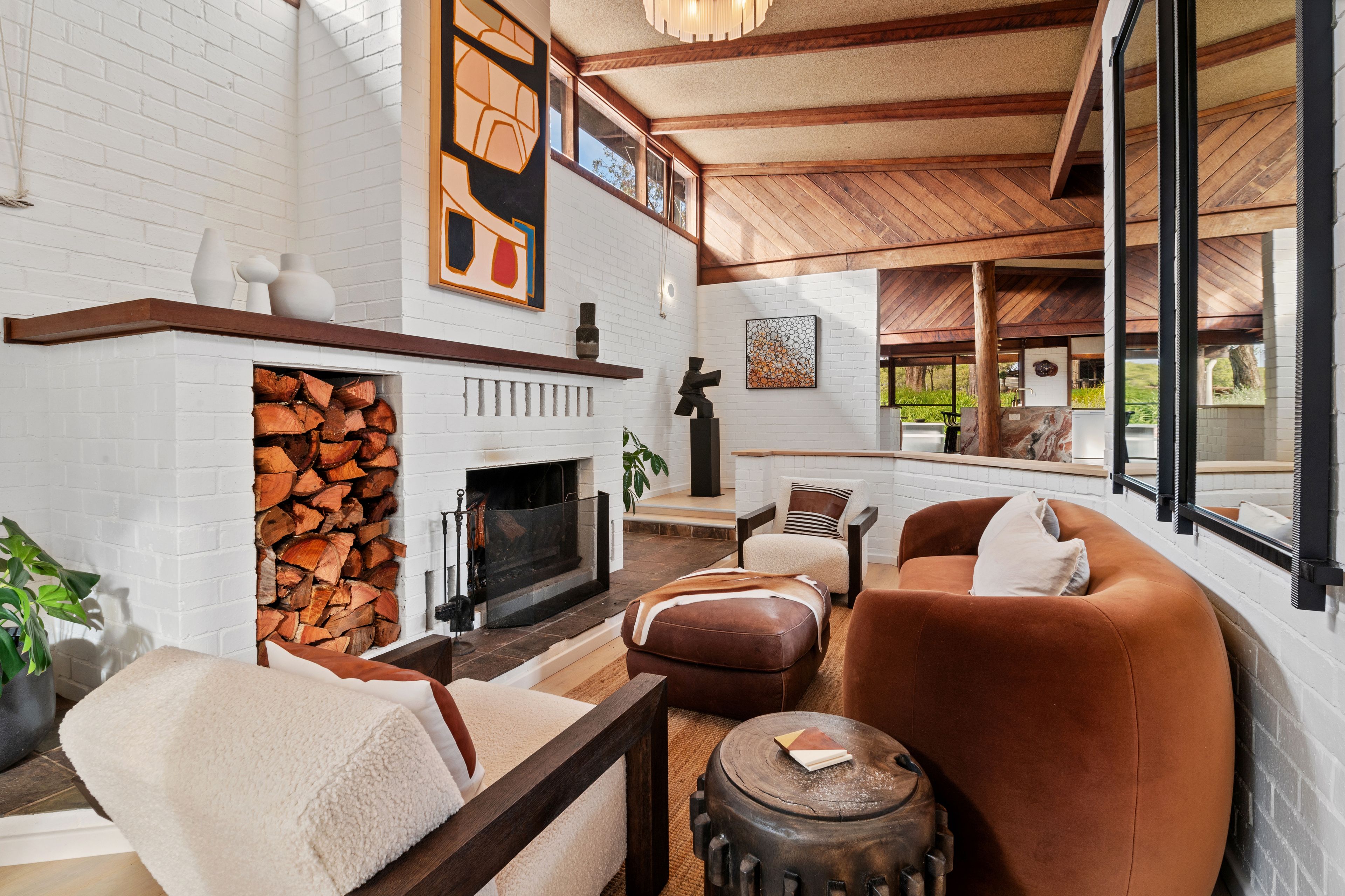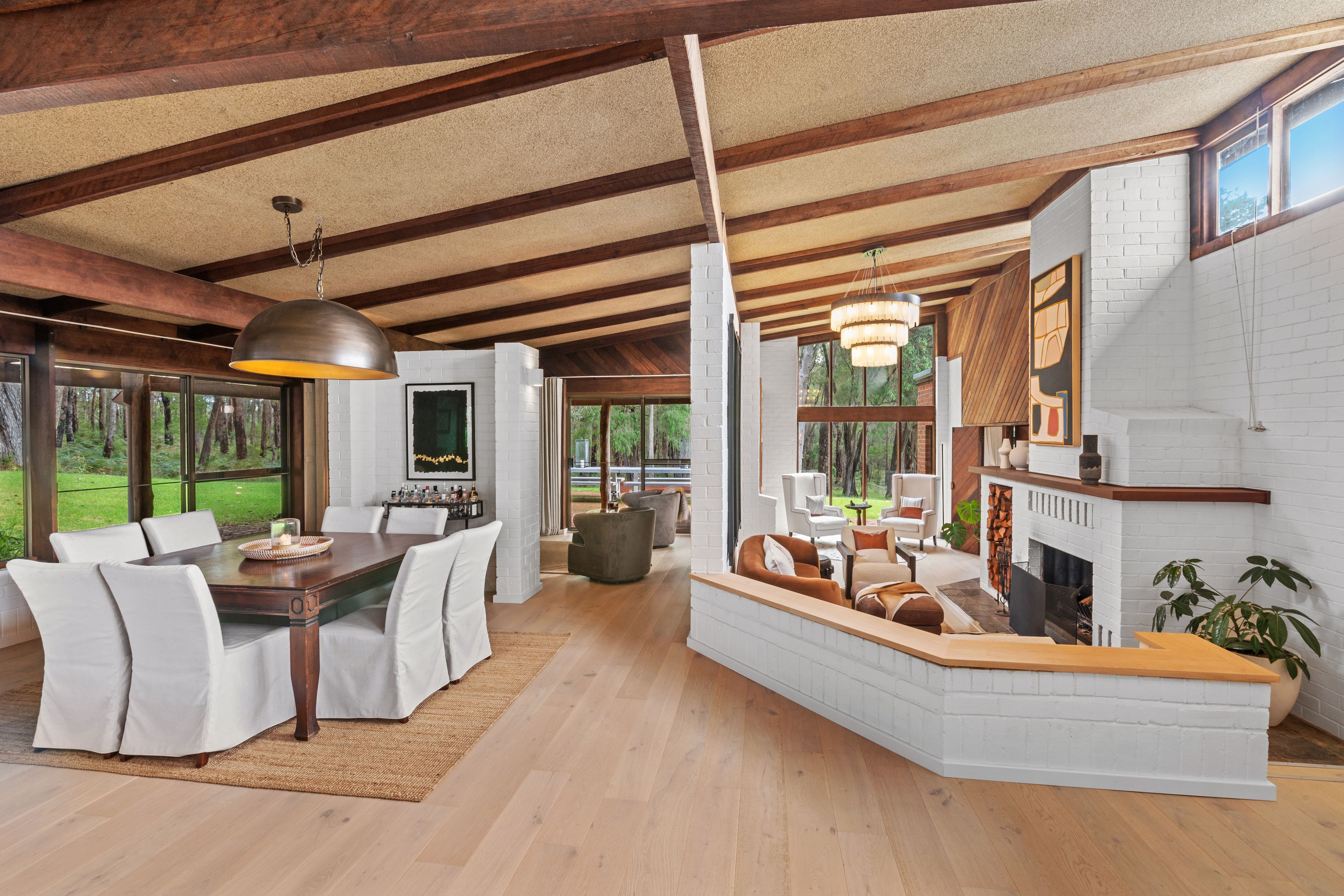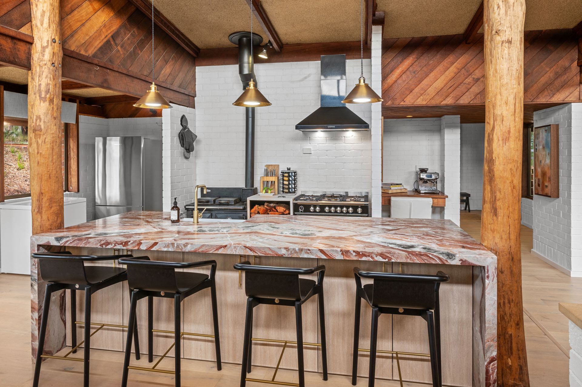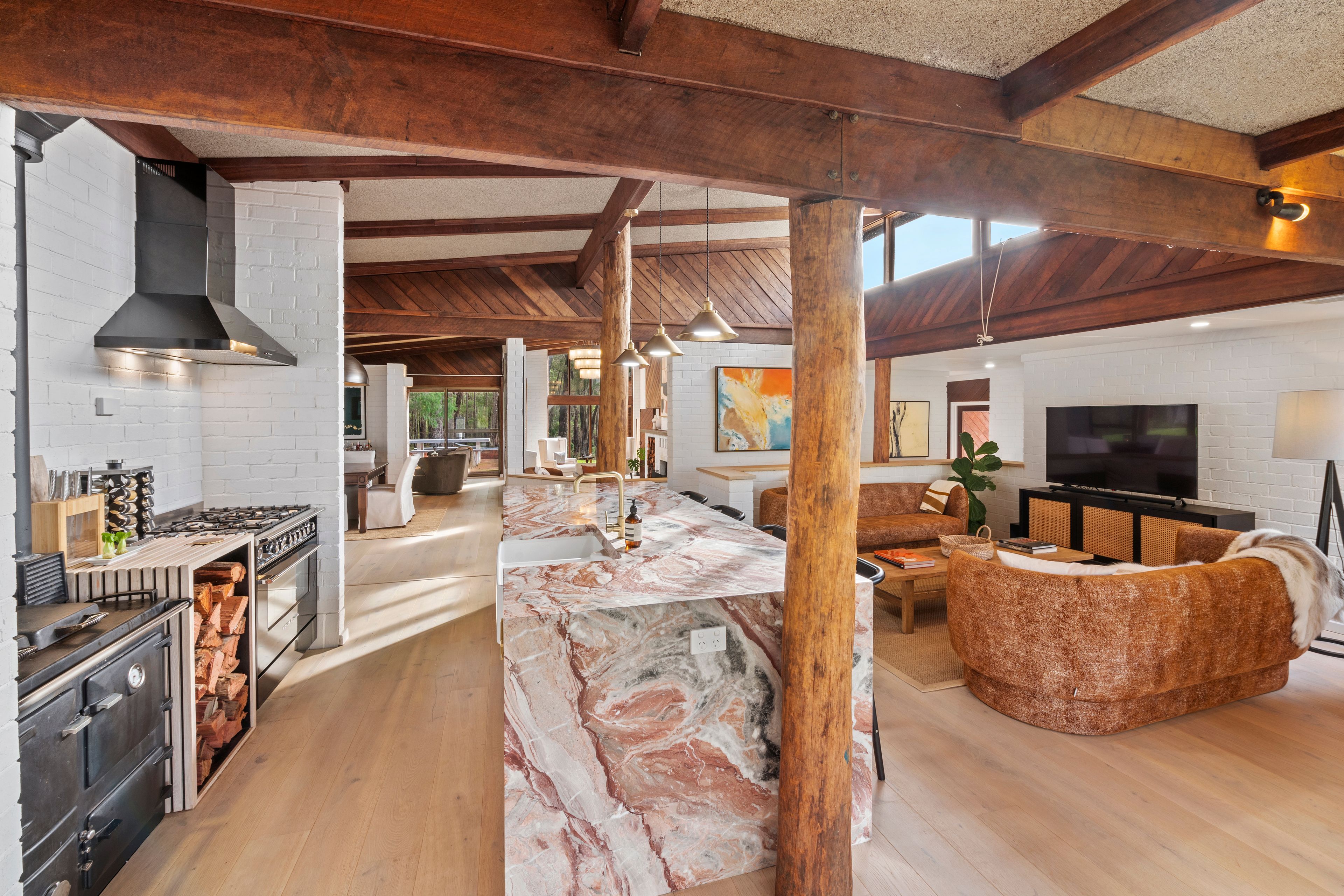 The home has been thoughtfully refurbished throughout, the different levels in the home form visual divisions and a twist of country sophistication! The kitchen with extra-large waterfall marble benchtops, large wood stove and 6 burner gas cooktop gives all year-round cooking options and plenty of space for the chef to work their magic! You will enjoy different spaces all through the home such as the sunken loungeroom nestled around the wood fire, allocated dining area, casual TV zone and quiet living space all encased within large timber windows extending the views to outside, the perfect spot to relax with a wine. Chic light toned flooring creates continuity and a complimentary tone to the darker timbers and with the white walls plus the natural light from the windows offers a simply beautiful ambiance.