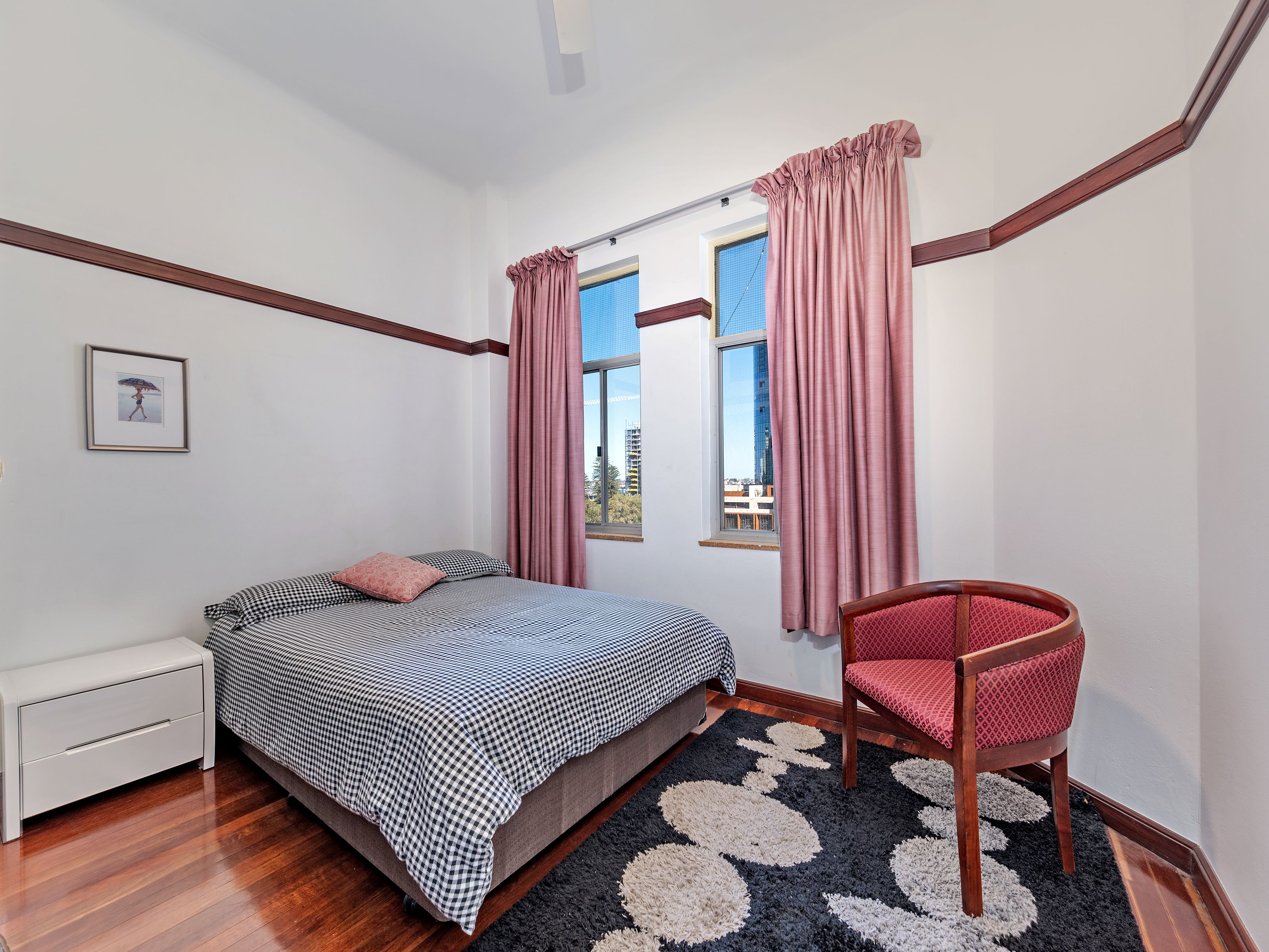 The stylish living area is spacious and steps out onto a large balcony that may be accessed from the lounge or the master bedroom. The master bedroom is provides ample storage space in the enormous floor to ceiling built-in robes. The lovely guest bedroom contains a free standing robe. The generous, modern kitchen has lots of bench and cupboard space plus a dishwasher. Gaze out at spectacular views of the river and Elizabeth Quay whilst whipping up a gourmet meal. Off the kitchen is a separate laundry complete with washer, dryer and all the necessary appliances. Also featured and in keeping with the character of a bygone era are pendant light fittings and highly polished timber floors. The bathroom offers modern fixtures with timeless styling and includes a separate bath & shower, vanity & toilet. There is air conditioning in the living area with ceiling fan in the 2nd bedroom.