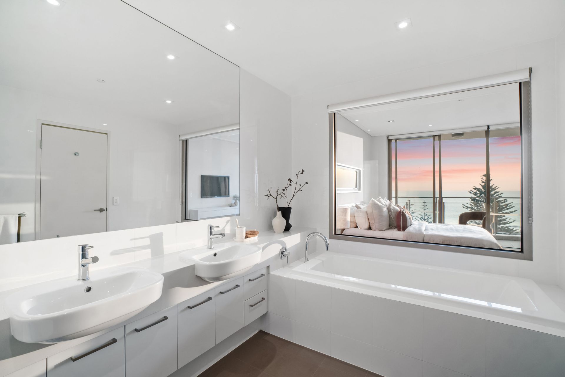 Back inside, the master suite is something quite extraordinary, with plush carpet, glass panel wall and sliding door to the balcony. On entering, we first pass the generous, walk-in robe before encountering the ensuite, offering twin stone vanities, shower and bath, with ocean views through the bedroom. The second and third bedrooms both boast floor-to-ceiling mirrored robes with ample storage. Bedroom three has yet another full-height glass panel wall with sliding doors and balcony overlooking the sparkling heated swimming pool. One of only two apartments on your lift-shaft floor, this apartment really does offer the ultimate in beachfront living.