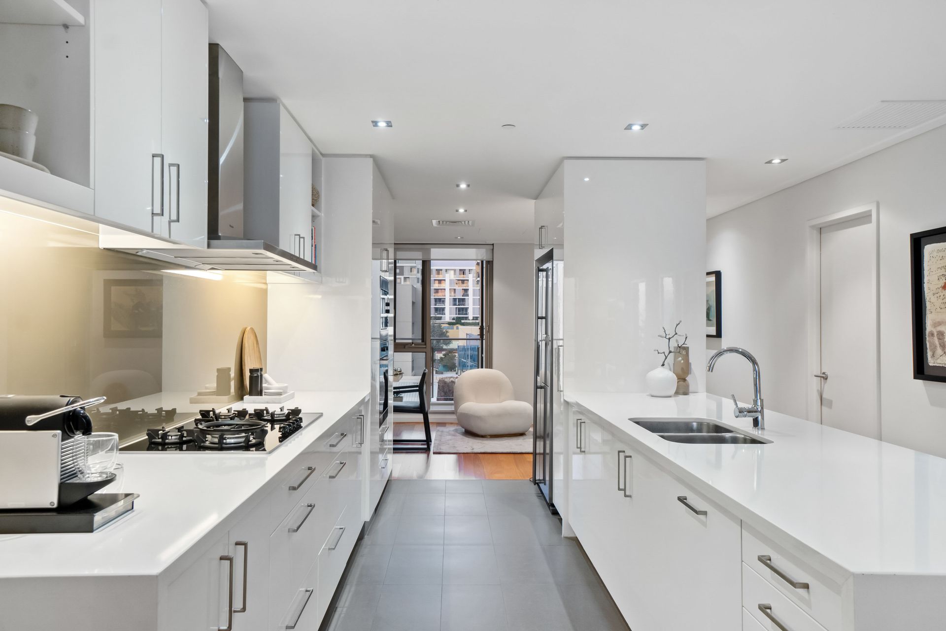 At the heart of this apartment is the lounge and dining area, with enough room to eat and entertain with at least eight people. The large, state-of-the-art kitchen sparkles with stone benchtops, glass splashbacks, sleek white laminated cabinetry, integrated Miele dishwasher, 5-burner gas cooktop, rangehood, microwave with oven duo and large fridge space. Beyond the kitchen is the sitting room/study area with the continuation of warm floorboards and another full-height glass panel and door leading to the rear, east-facing balcony, which gathers the superb morning sun while looking over the 20m pool.