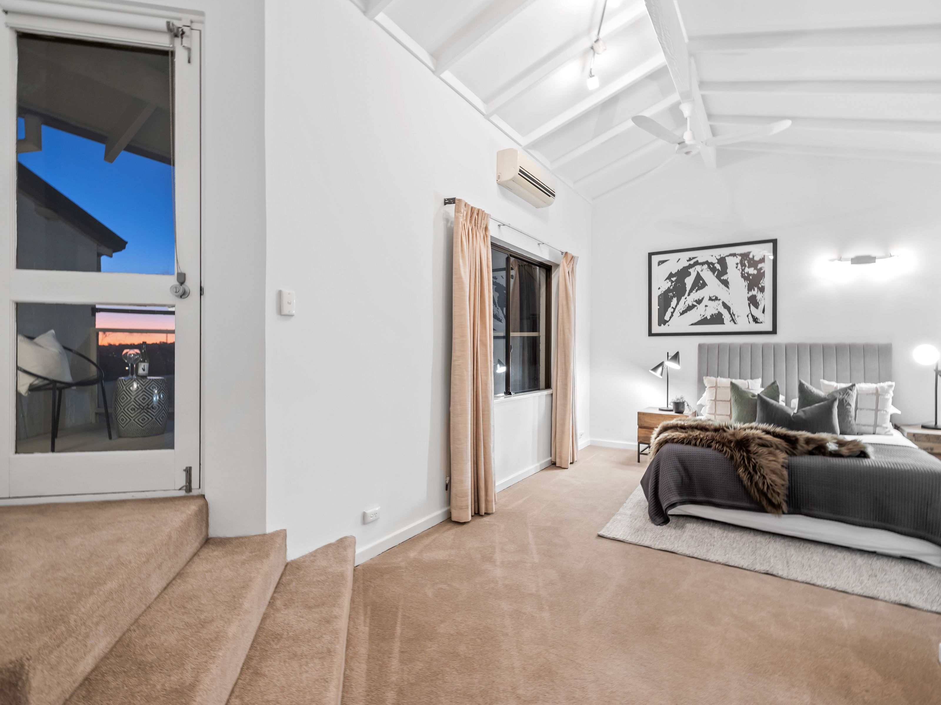 WHAT'S TO LOVE INSIDE? • Solid wooden floorboards and high ceilings • Versatile and spacious two-tiered living area with split system A/C and space for a dining table • Fully equipped kitchen which overlooks the rear courtyard • Renovated bathrooms • Separate laundry off kitchen, complete with storage and access into the powder room • Large master ensuite with high raked ceilings, modernly renovated, with walk-in-robe, split-system air-conditioning, ceiling fan and outdoor access to a raised balcony deck with a snapshot of the river and its own mesmerising vista over the neighboring treetops. • Carpeted upstairs bedrooms, including large 2nd/3rd minor bedrooms with built-in robes • Double-door storage cupboard • Mezzanine storage loft with its own ladder