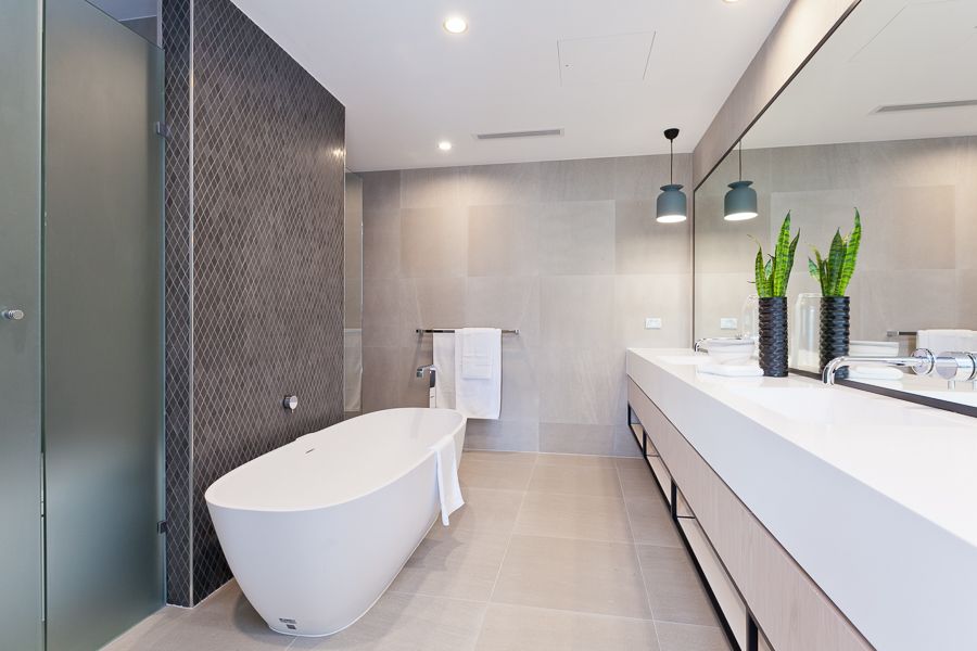 Bathrooms with seamless Ollocento integrated basins, or wash plane basins, stone tiling, an Apaiser freestanding stone composite bath