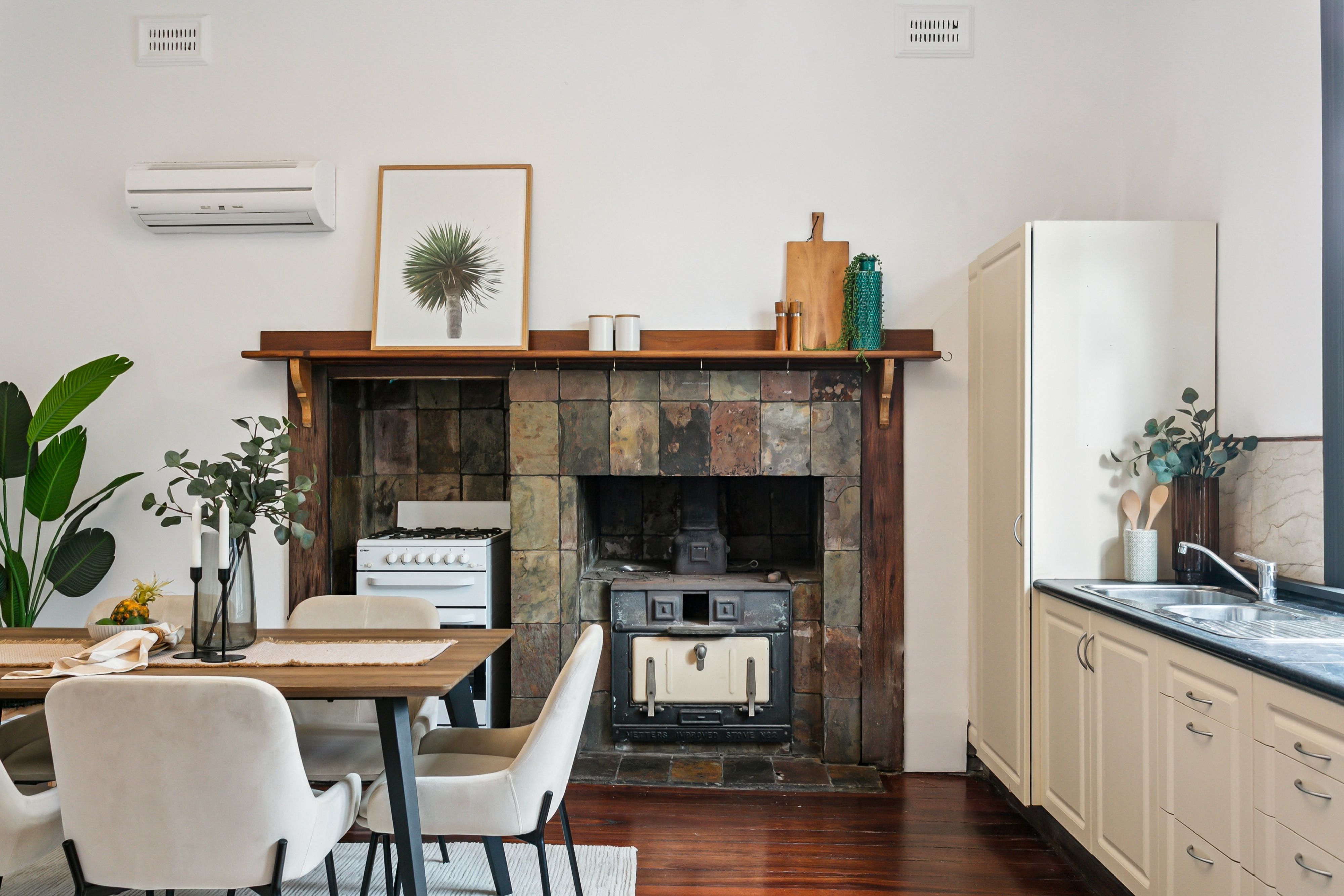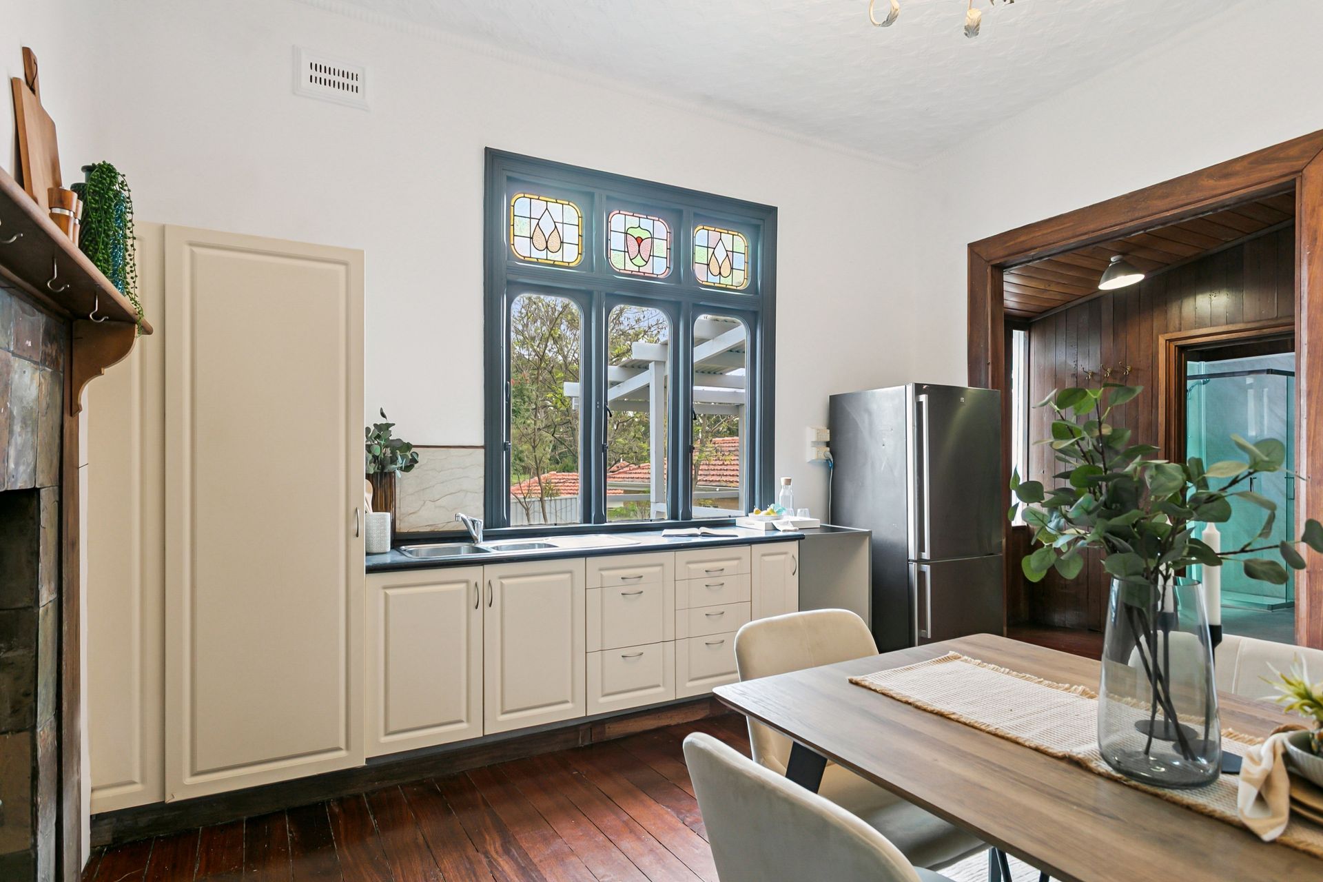 The spacious central lounge room is kept comfortable all year-round by a split-system air-conditioning unit. The country-style open-plan kitchen and dining area keeps meals separate from conversation, comprising of another split-system air-conditioner, a servery window into the lounge, a storage pantry, double sinks, an original Metters stove, a Chef gas-upright cooker and lovely views out to a sunken north-facing backyard - with lawn, a sitting courtyard under the trees and shade, a large outdoor laundry (with storage and a double wash trough), an outdoor powder room and even an outdoor rain shower. All accompanied by the sounds of chirping local birdlife singing away, up in the surrounding treetops.