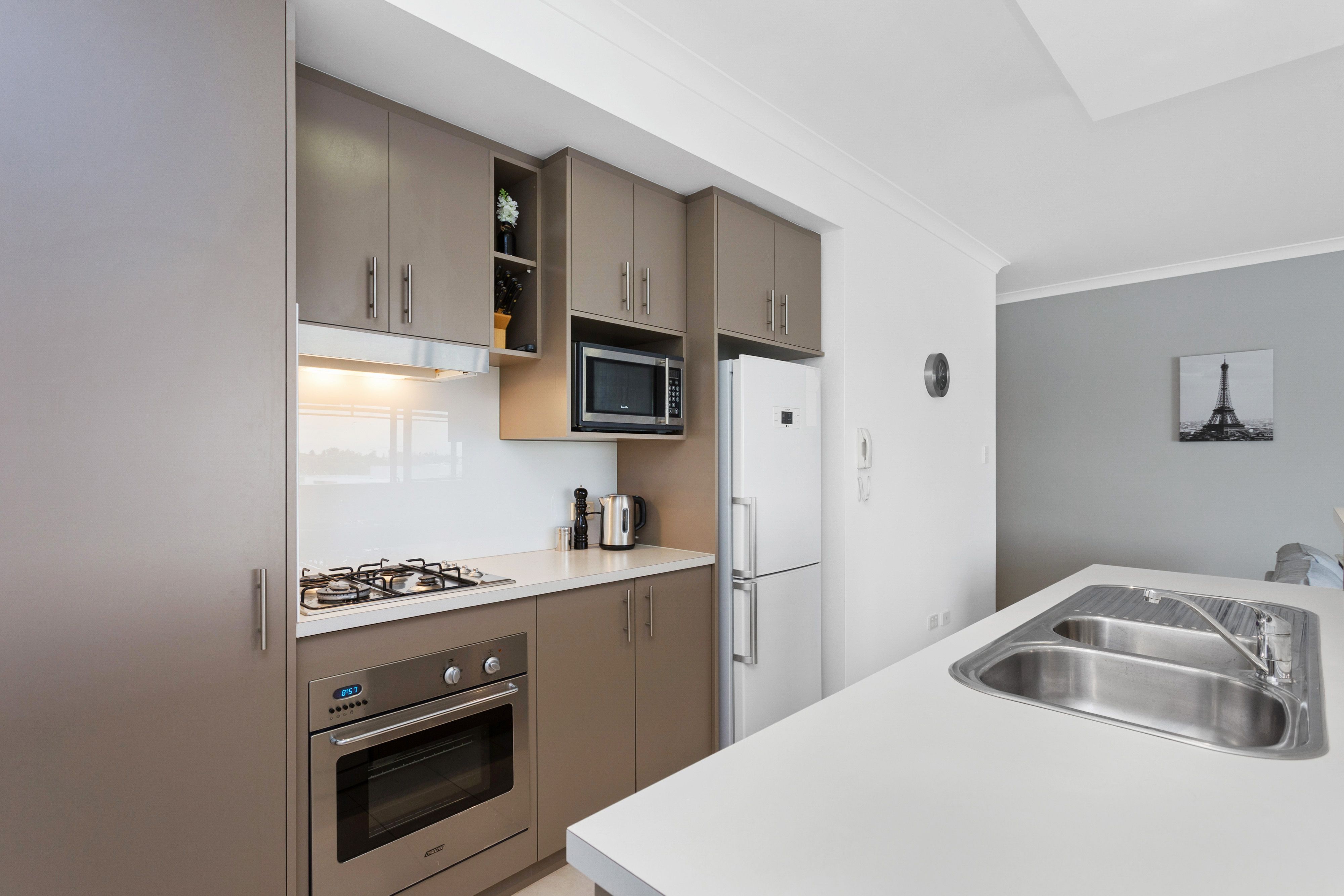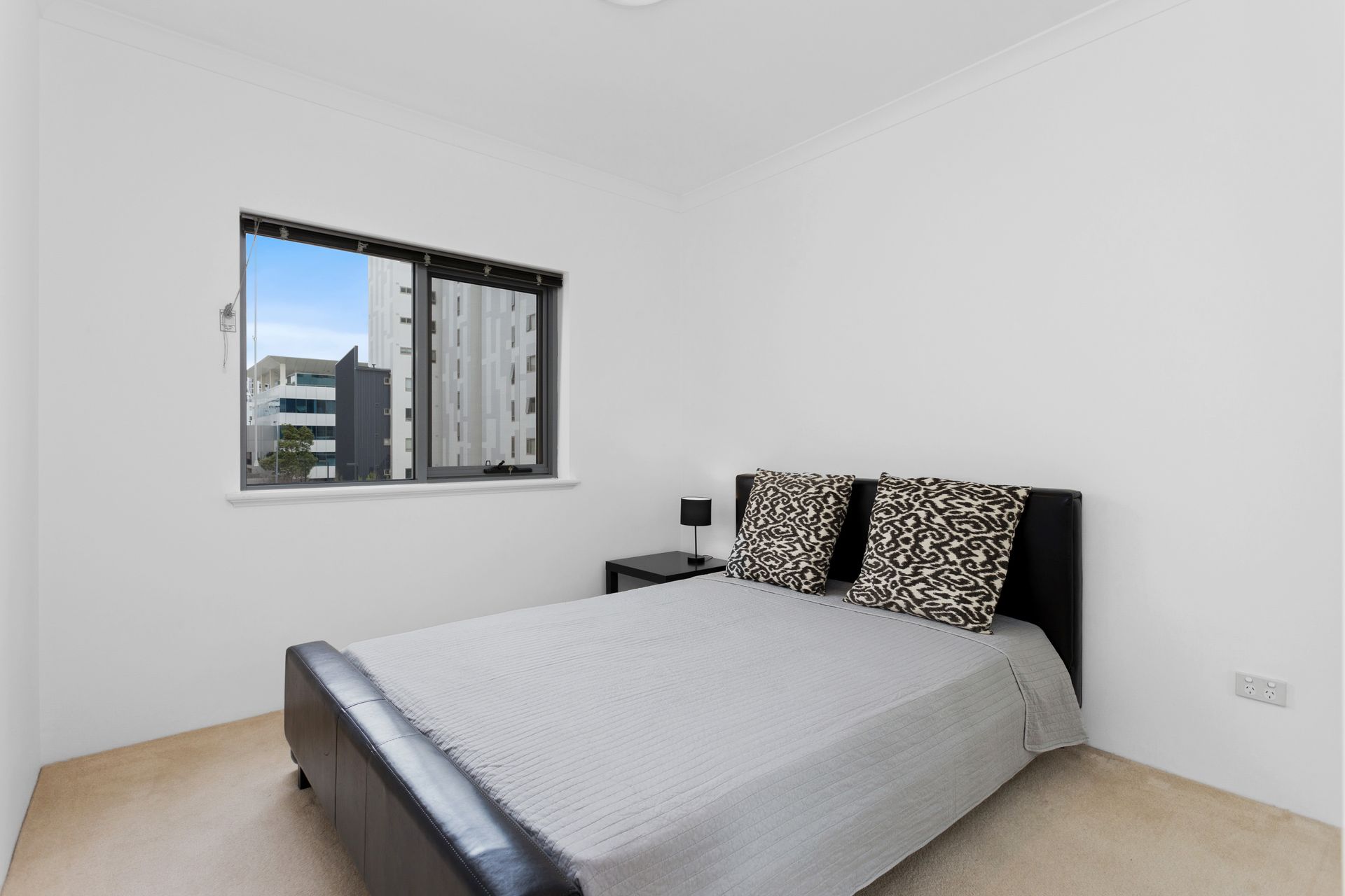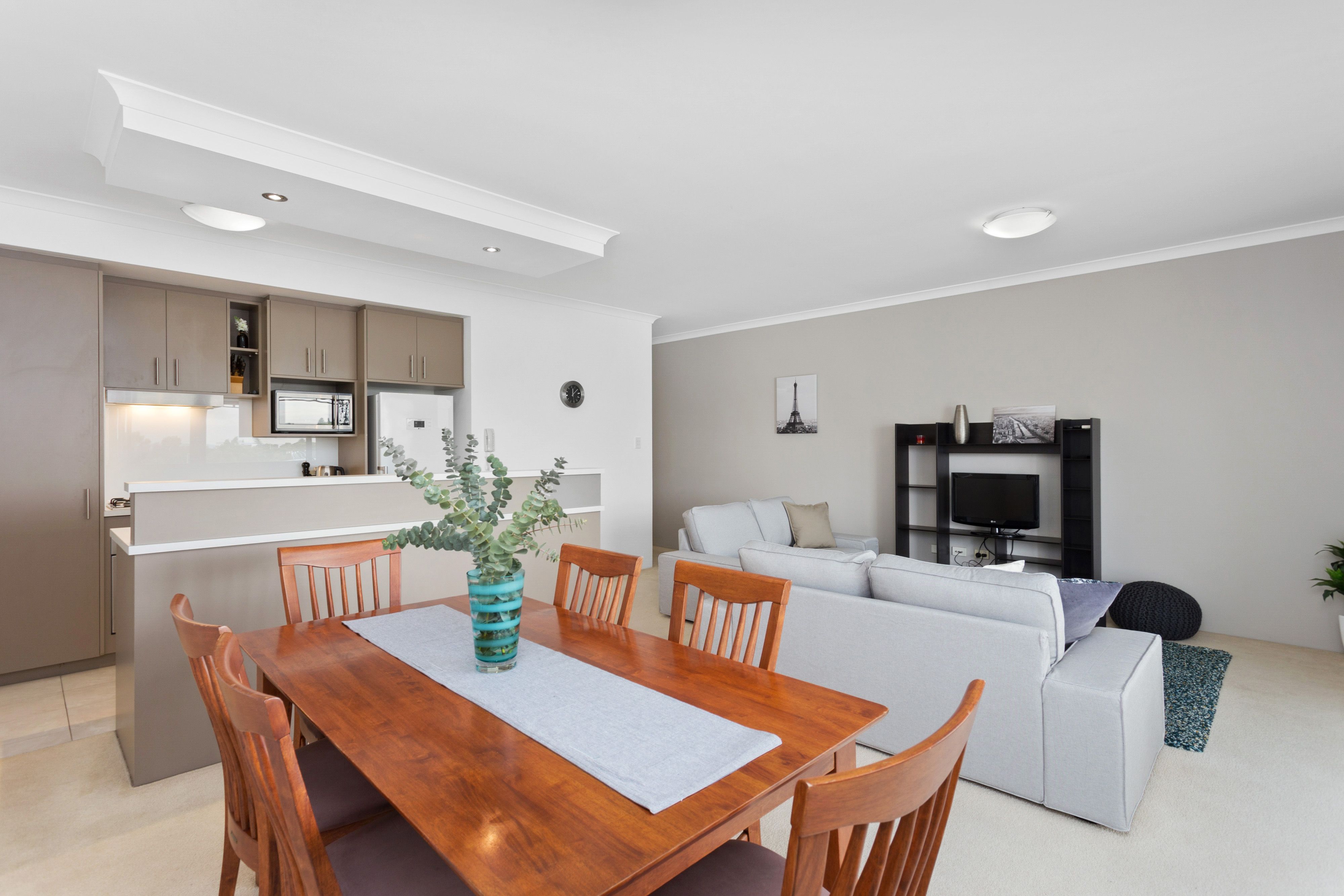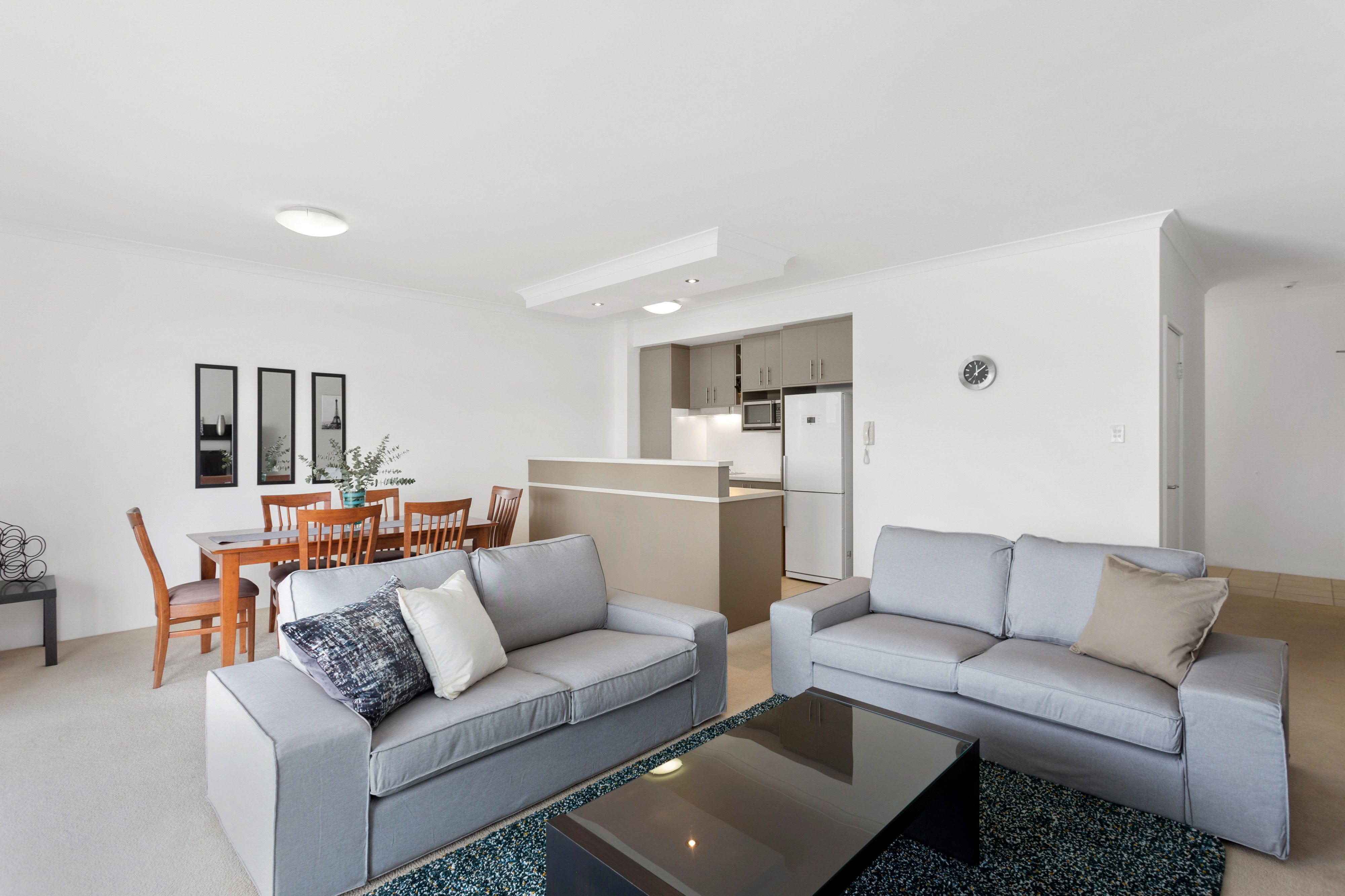 This 2 bedroom fully furnished apartment offers a clean crisp space right from the front door. The open plan kitchen and living areas are flooded with natural light and open out to a spacious balcony overlooking the city with a beautiful night-time light display. The kitchen is fully equipped with quality finishes. Both bedrooms have built-in wardrobes while the main bedroom has a walk-in wardrobe and ensuite bathroom. The well-maintained complex offers a gym, sauna, common room and in-ground swimming pool.