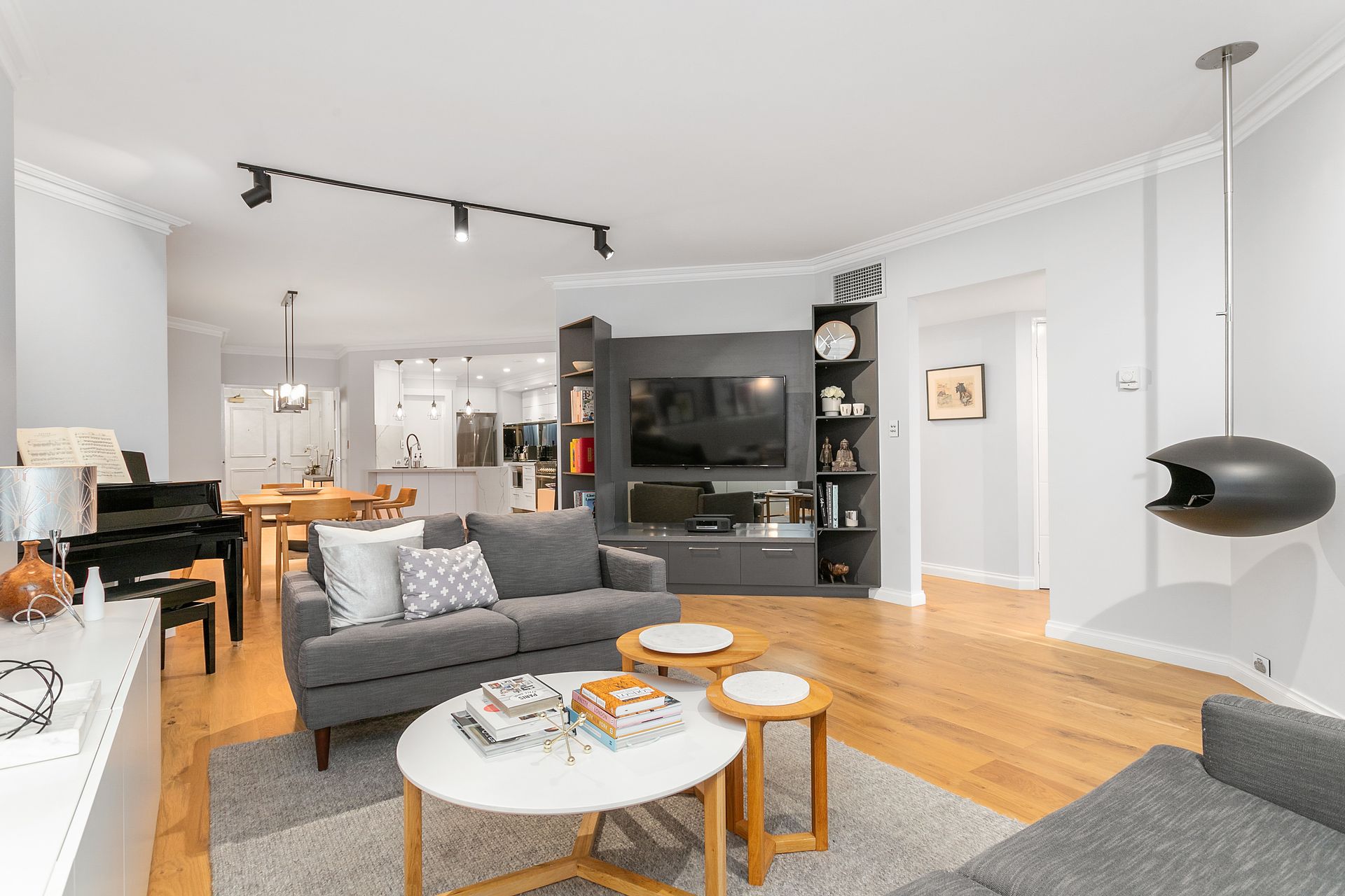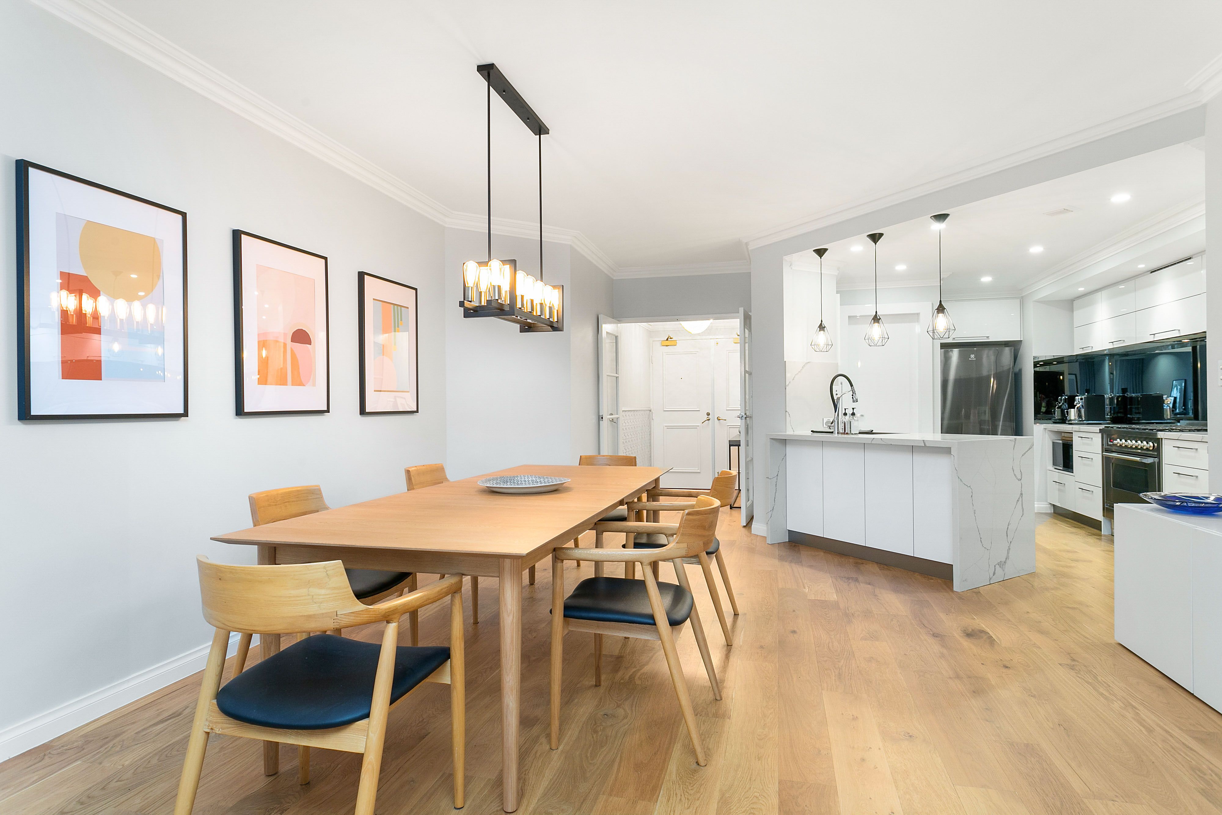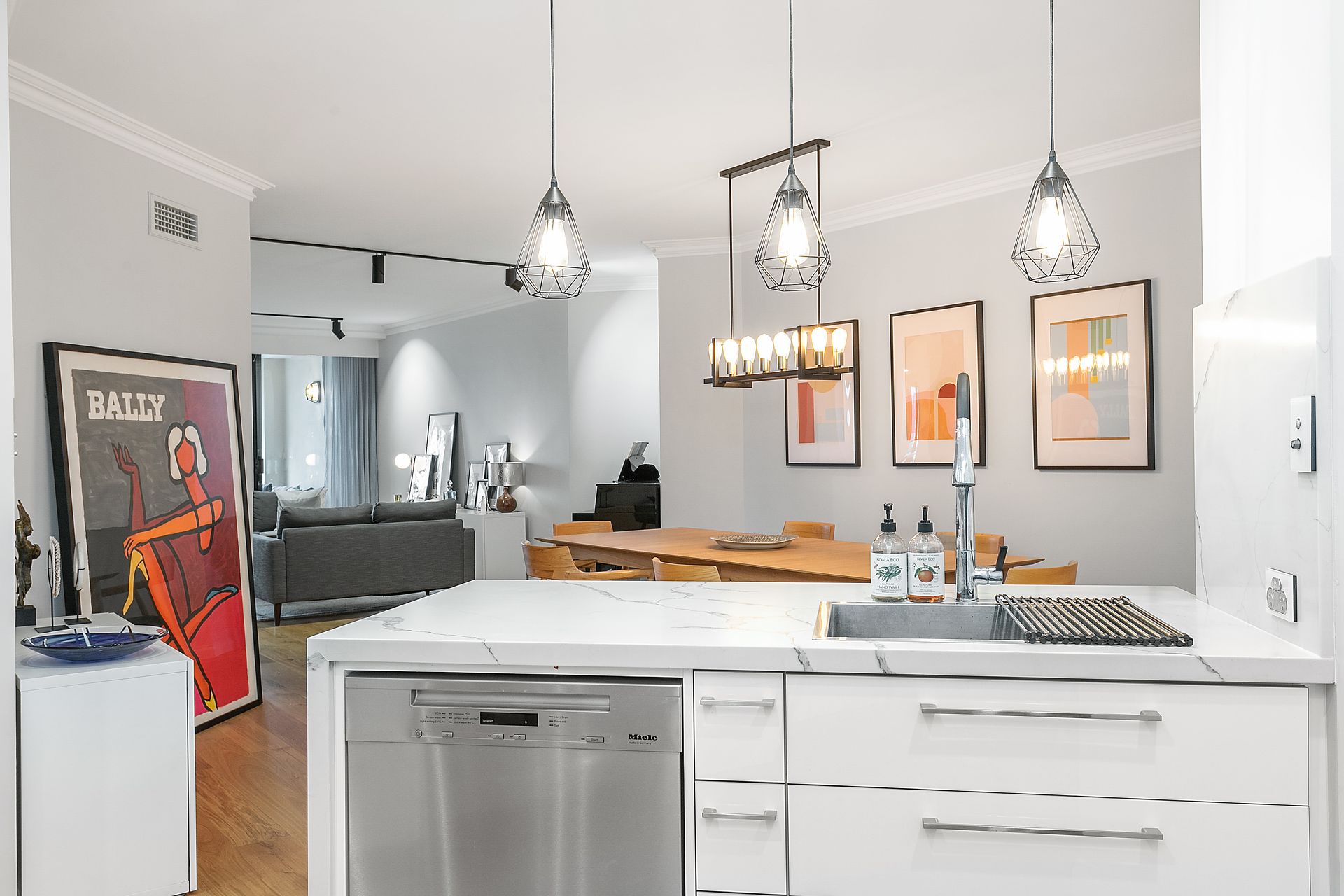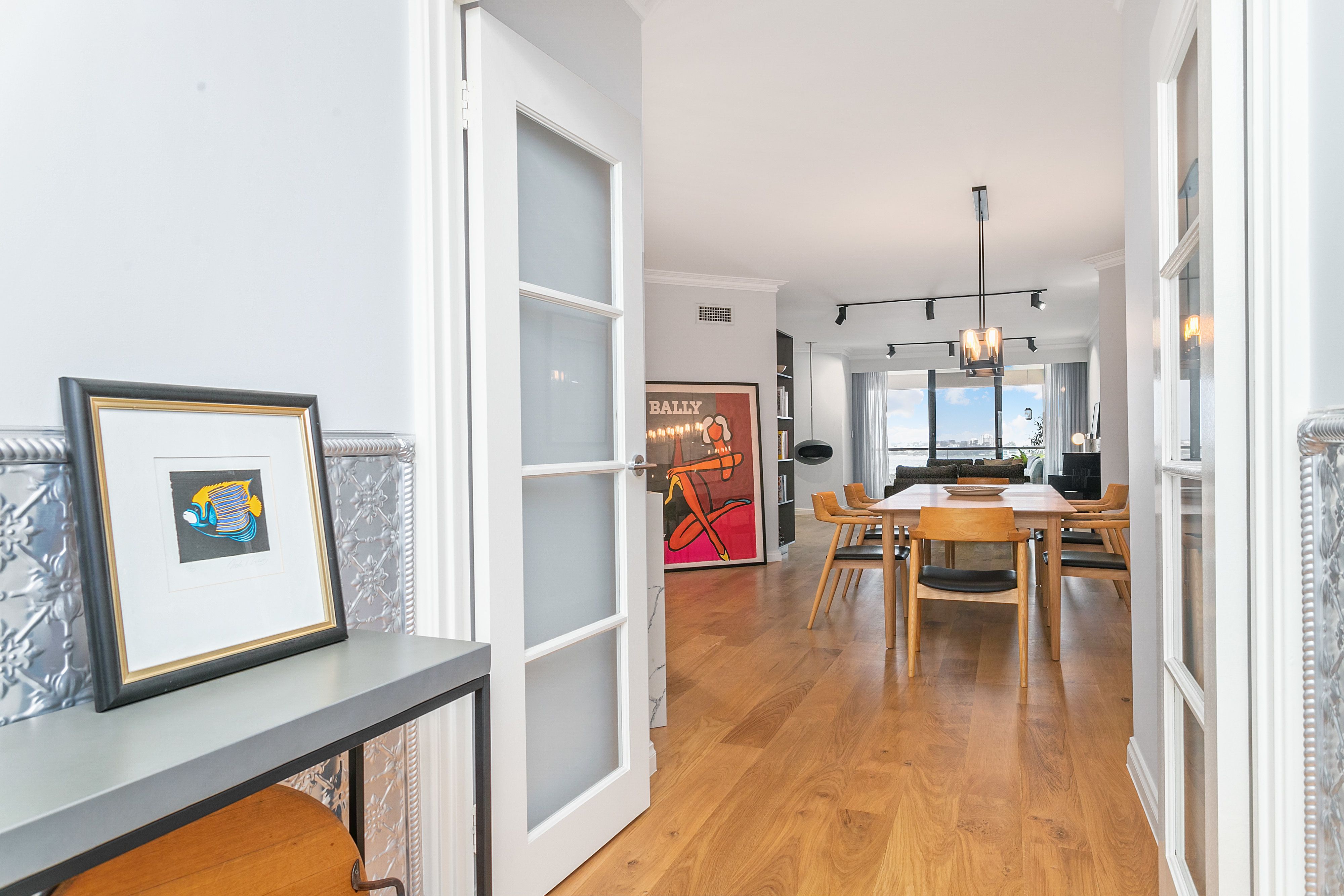 An entrance hall with pressed tin and modern chandelier provides a luxurious entrée to the apartment, and sets the tone for the space to unfold. The generous balcony extends the ample living space into the outdoors, bringing you amongst the panoramic River, Park and City views, and an ethanol fire provides a warming focal point to the indoor living space.
